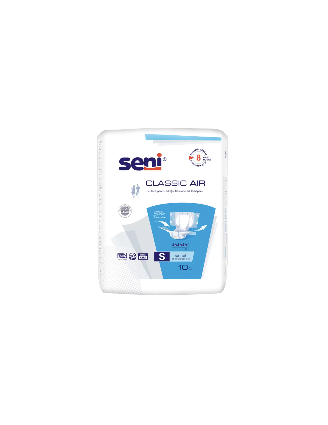 Seni Scutece adulti Classic Air Small x 10 buc asigura siguranta si igiena zilnica, mentinand pielea uscata si protejata.