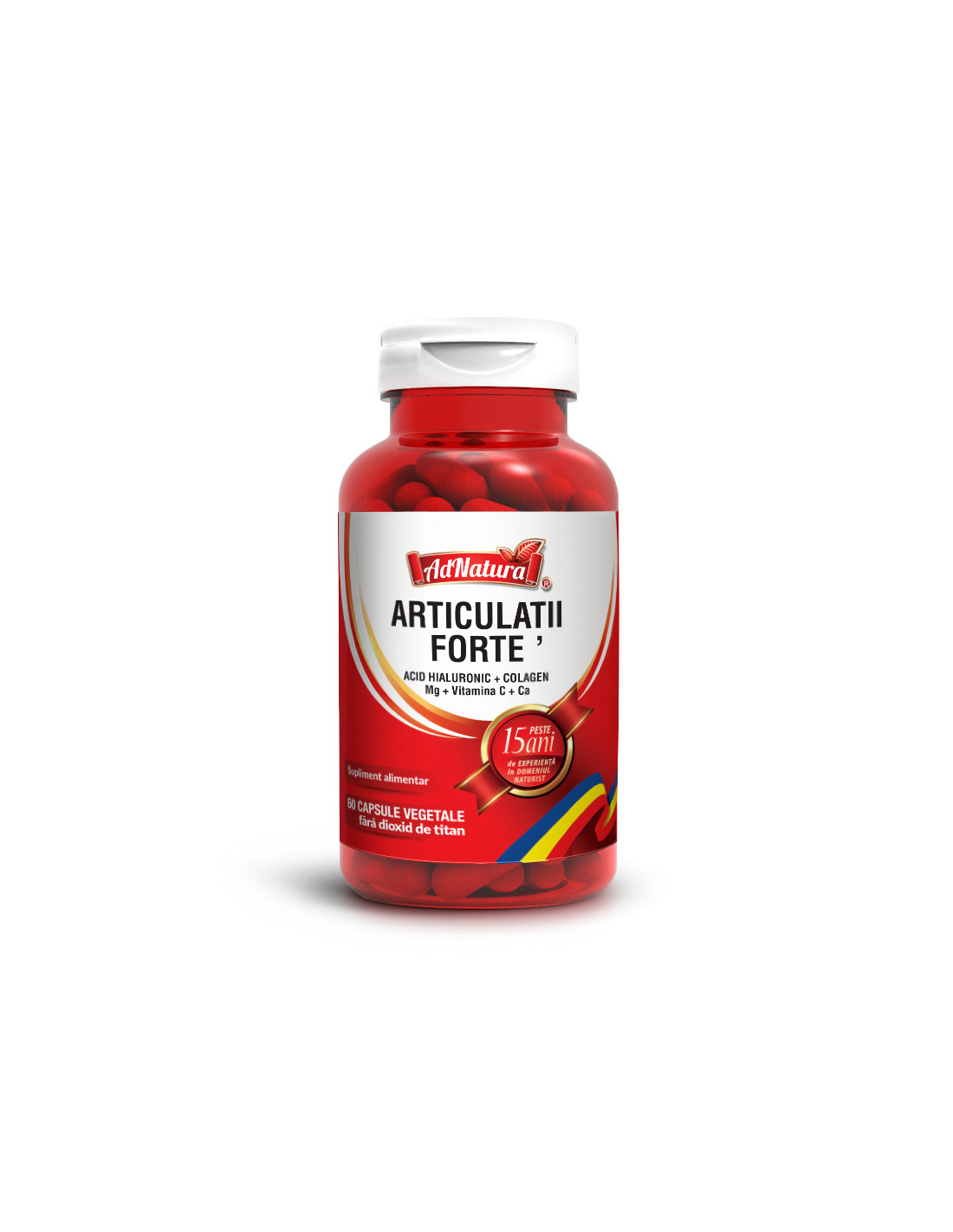 AdNatura Articulații Forte – 60 capsule este un supliment alimentar complex, formulat special pentru susținerea sănătății articulațiilor, tendoanelor și ligamentelor. Conține ingrediente recunoscute pentru efectele lor benefice asupra mobilității și regenerării cartilajului articular: glucozamină, condroitină, MSM, colagen și vitamina C.