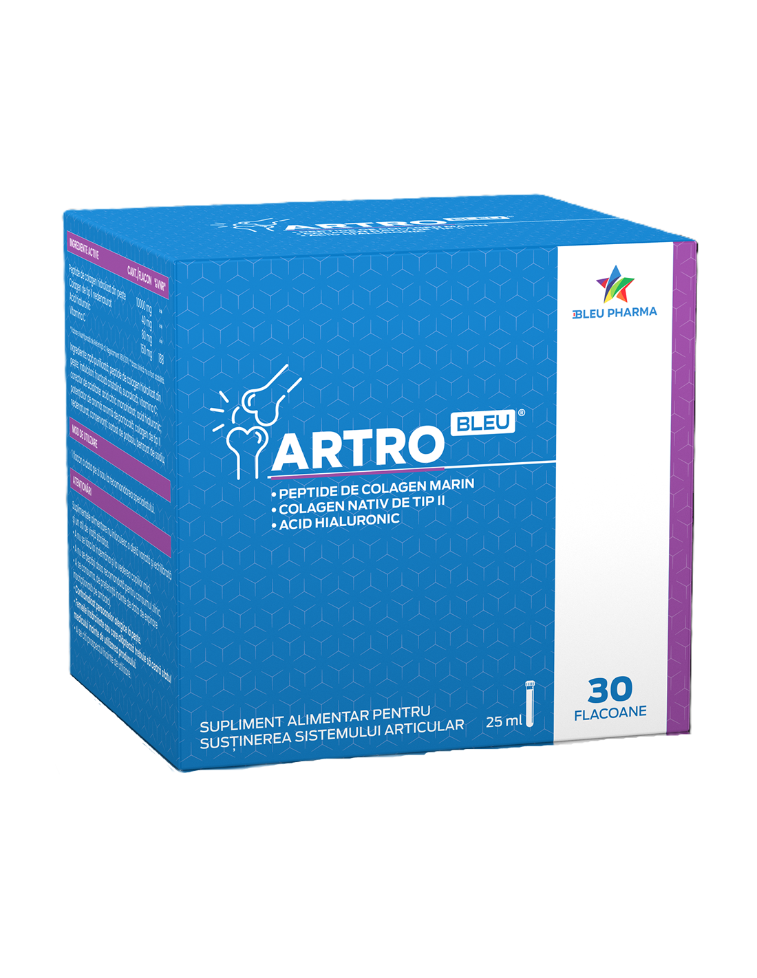 Artro Bleu – 30 flacoane x 25 ml este un supliment alimentar destinat susținerii sănătății sistemului articular. Formula conține o combinație de peptide de colagen marin, colagen de tip II nedenaturat, acid hialuronic și vitamina C, ingrediente care pot contribui la regenerarea cartilajului, protejarea colagenului și stimularea sintezei acestuia. :contentReference[oaicite:1]{index=1}