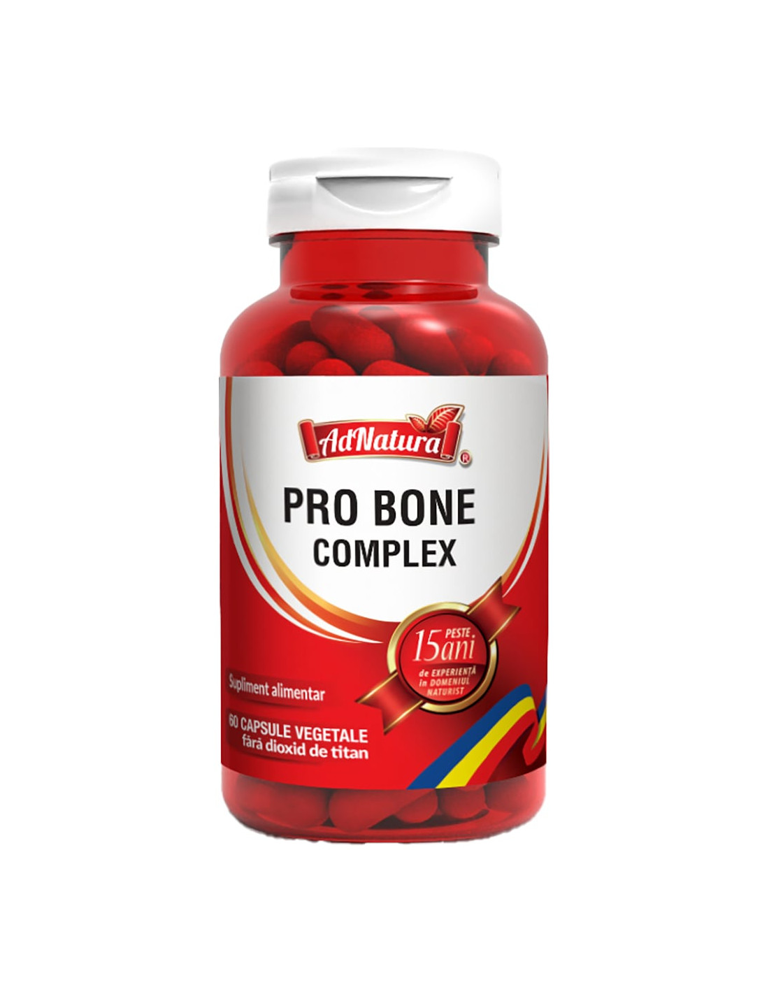 Pro Bone Complex AdNatura este un supliment alimentar premium, conceput pentru a susţine sănătatea sistemului osos, a articulaţiilor şi mobilitatea. Formula combină ingrediente de înaltă calitate: calciu natural obţinut din alge marine calcaroase (Lithothamnion sp.), peptide bioactive de colagen, magneziu bisglicinat, extract din fructe de acerola (vitamina C), cartilaj de rechin standardizat şi vitamina D3 naturală.