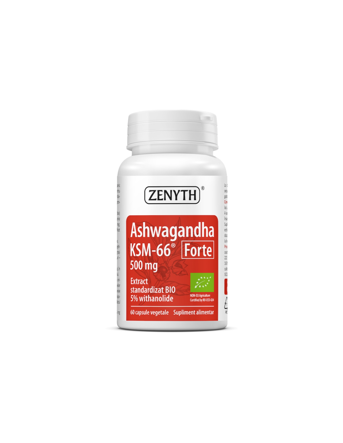 Ashwaghanda KSM-66 Forte 500 mg – 60 capsule, Zenyth este un supliment alimentar organic ce utilizează extract standardizat KSM-66 din rădăcină de Withania somnifera (ashwagandha), cu 5 % withanolide, destinat susținerii răspunsului la stres și echilibrului neurohormonal.