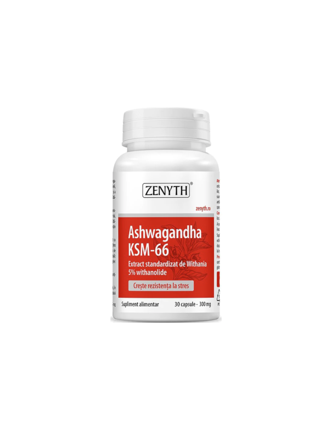 Ashwagandha KSM-66, 30 capsule, Zenyth este un supliment alimentar care conține extract standardizat de Withania somnifera (ashwagandha) cu 5 % withanolide, formulat pentru a sprijini răspunsul organismului la stres, echilibrul mental și vitalitatea.