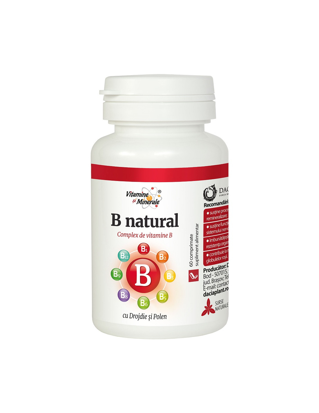 Vitamina B cu drojdie și polen de la Dacia Plant este un supliment alimentar natural care conține un complex complet de vitamine din grupa B, obținut din surse naturale: drojdie de bere inactivă și polen. Produsul contribuie la funcționarea normală a sistemului nervos, a metabolismului energetic și la menținerea sănătății pielii, părului și unghiilor.