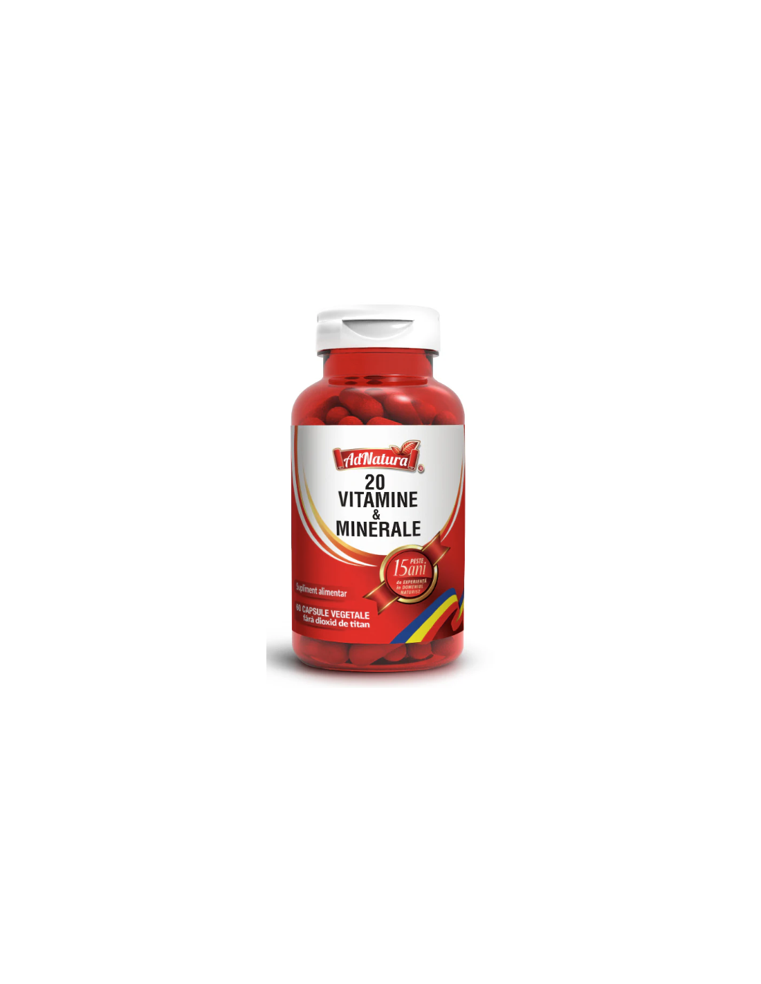 AdNatura 20 Vitamine și Minerale – 60 capsule este un supliment alimentar complex, formulat pentru susținerea sănătății generale, a imunității și a nivelului optim de energie. Conține un amestec echilibrat de vitamine, minerale și extracte naturale care contribuie la buna funcționare a organismului în perioade de efort fizic sau mental intens.