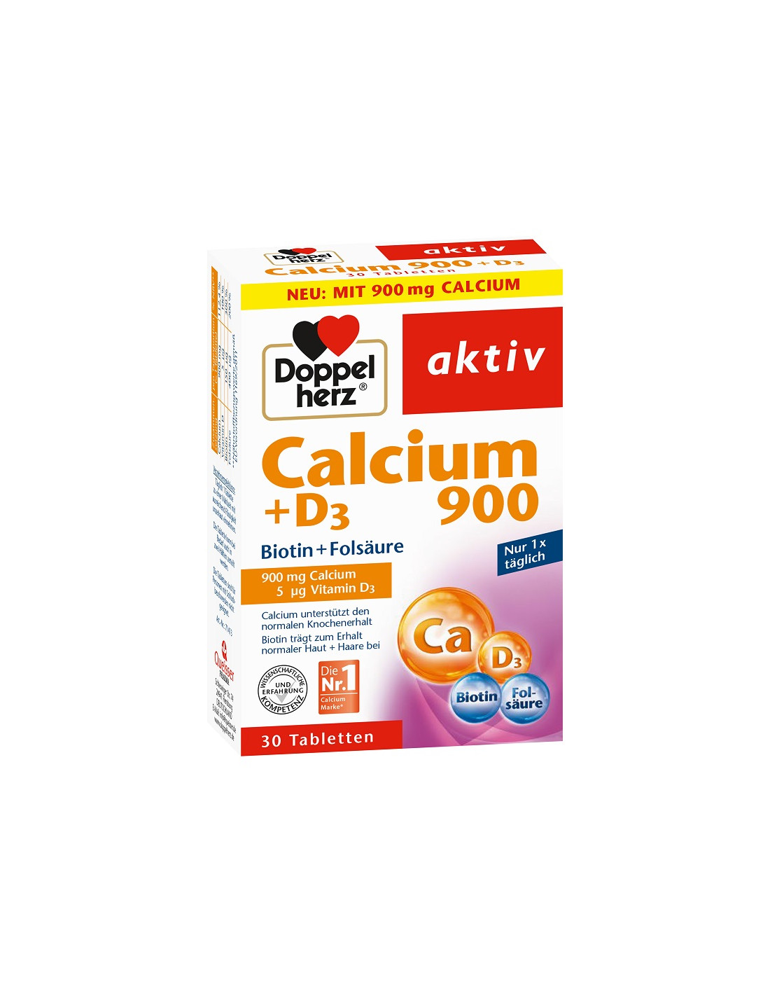 Doppelherz Aktiv Calciu 900 + D3 + Biotină + Acid Folic este un supliment alimentar conceput pentru a susține sănătatea sistemului osos și a metabolismului mineral. Produsul conține **900 mg calciu**, **vitamina D3**, **biotină** și **acid folic** într-o formulă completă, ideală pentru aport zilnic.