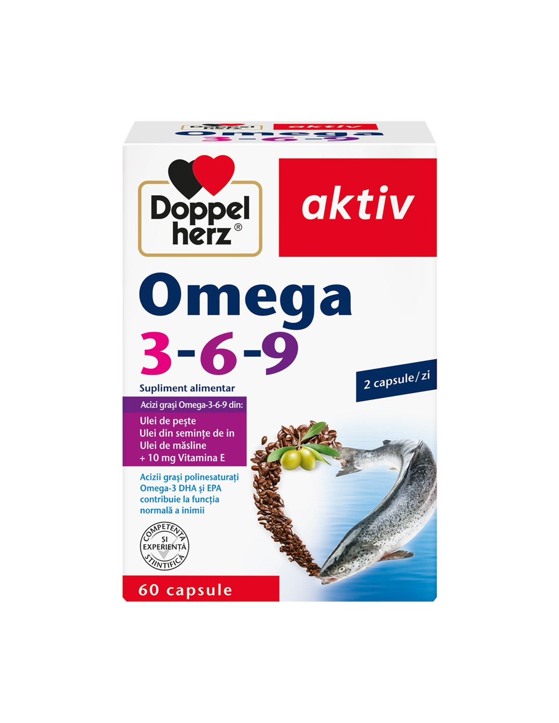Doppelherz Aktiv Omega-3-6-9 este un supliment alimentar care reunește acizi grași esențiali din trei clase: omega-3, omega-6 și omega-9, împreună cu vitamina E pentru protecția antioxidantă. Fiecare doză cotidiană (2 capsule) furnizează aproximativ 776 mg omega-3, 160 mg omega-6 și un aport de vitamina E conform standardelor produsului.