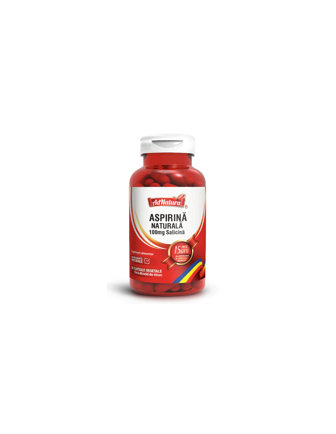 AdNatura Aspirină Naturală 100mg salicină – 60 capsule este un supliment alimentar pe bază de extract natural din scoarță de salcie (Salix alba), sursă naturală de salicină – precursor al acidului salicilic. Produsul are efecte calmante, antiinflamatoare și antireumatice, contribuind la menținerea confortului articular și a circulației normale.