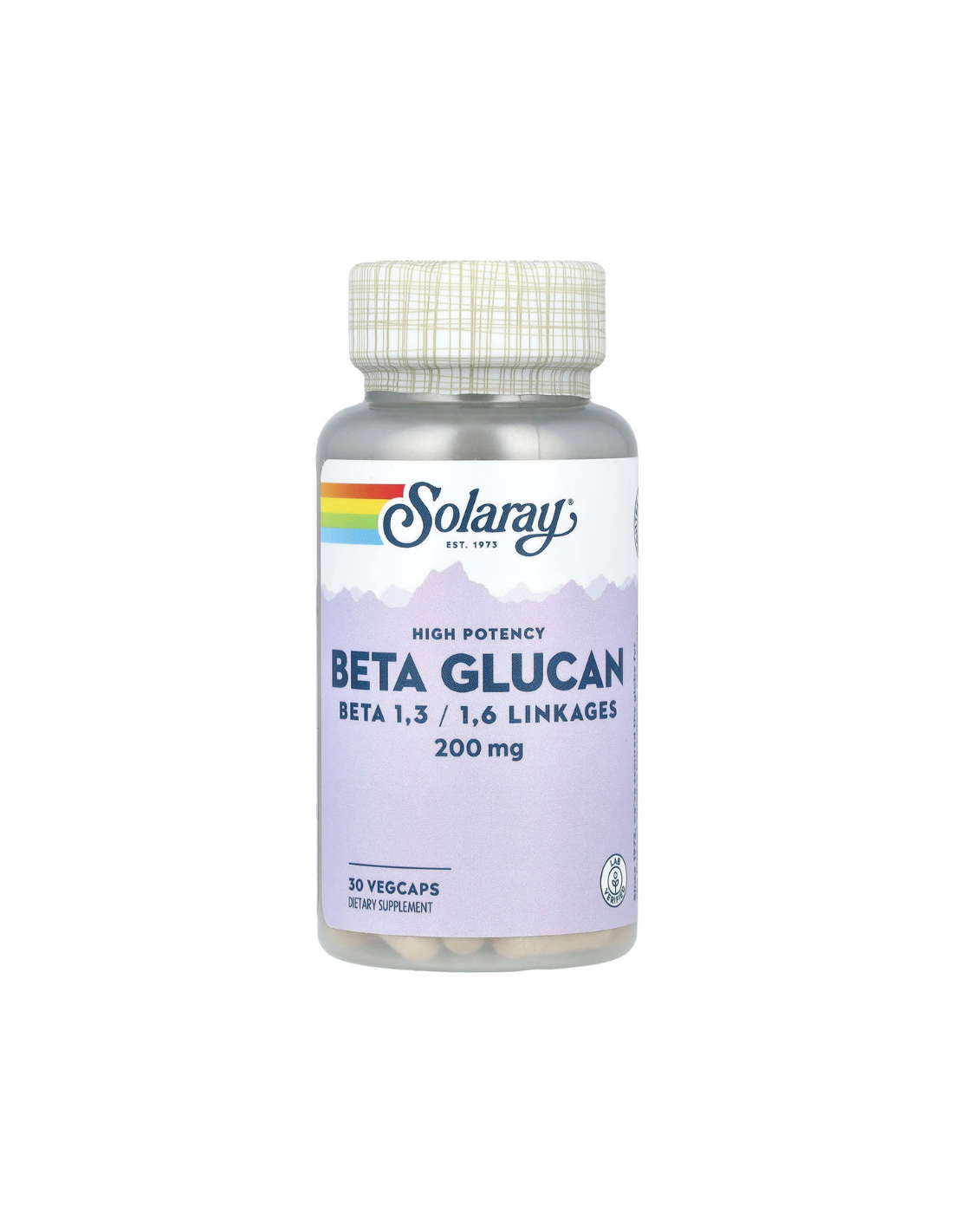Solaray Beta Glucan 200 mg – 30 VegCaps este un supliment alimentar pe bază de **β-glucan** (polizaharidă insolubilă) extras din pereții celulari ai drojdiei de panificație, sub formă de capsule vegetale. *