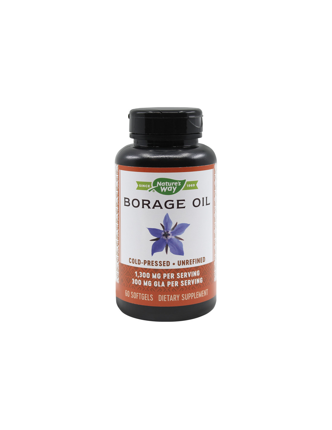 Nature’s Way Borage Oil 1.300 mg – 60 softgels este un supliment alimentar pe bază de ulei de semințe de Borago officinalis, presat la rece și neîndoit, cu un conținut garantat de ~24 % GLA (acid gamma-linolenic).*
