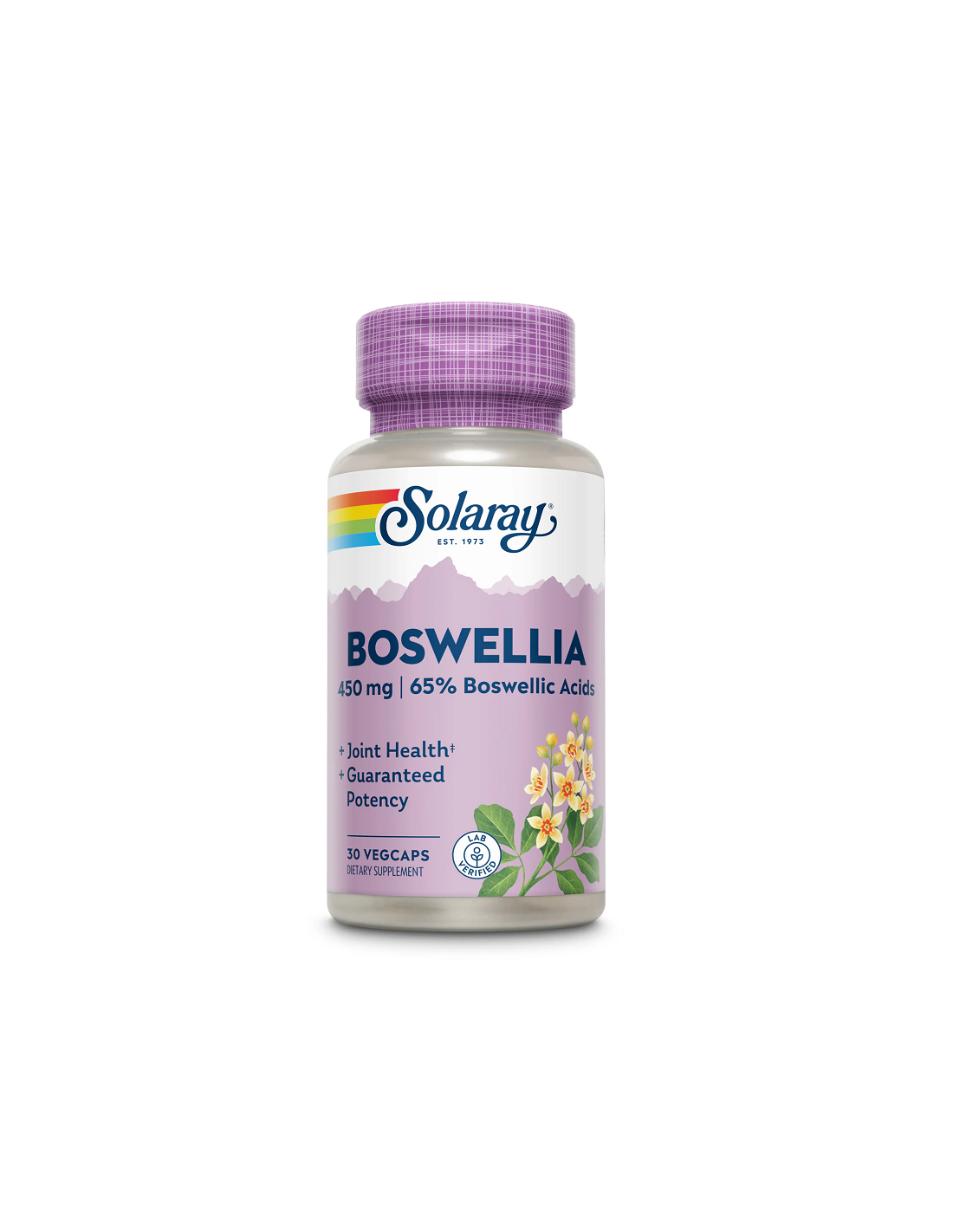- Activitate antiinflamatoare datorită acizilor boswelici (componenta activă) (*65 % boswelici acid tipic) — similar produsului Solaray care conține 65 % acizi boswelici
