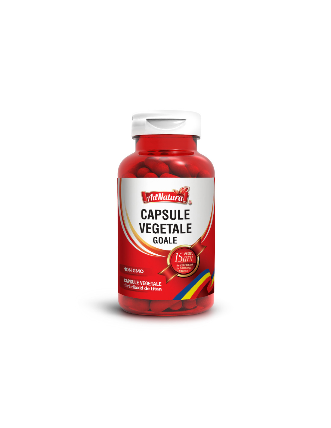 AdNatura Capsule vegetale goale – 100 capsule sunt realizate din hidroxipropilmetilceluloză (HPMC), o alternativă 100% vegetală la capsulele clasice din gelatină. Acestea sunt potrivite pentru prepararea suplimentelor alimentare personalizate, pudrelor din plante sau vitaminelor, fiind complet inodore, transparente și ușor de utilizat.