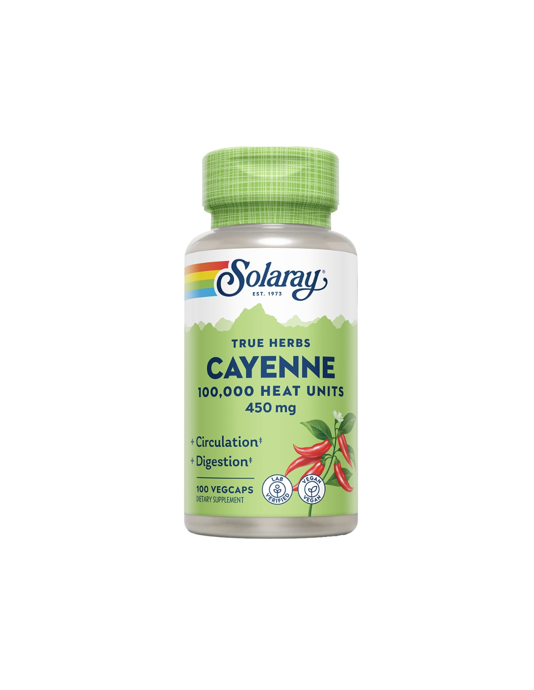 Solaray Cayenne Pepper 450 mg – 100 capsule vegetale (100 000 Heat Units) este un supliment alimentar care furnizează extract de ardei iute (Capsicum annuum) standardizat la 100.000 unități de căldură (HU), utilizat tradițional pentru sprijinul digestiei, metabolismului și circulației.*