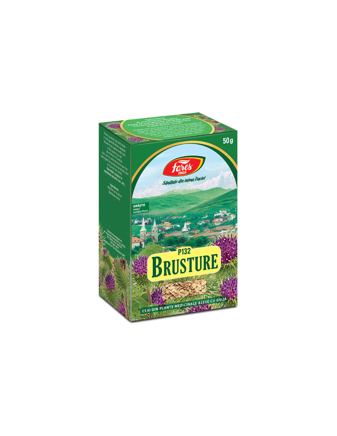 Ceai rădăcină de Brusture P132 50 g – Fares este un ceai fitoterapic obținut din rădăcina plantei Arctium lappa, utilizat tradițional pentru proprietățile sale detoxifiante, diuretice și purificatoare.