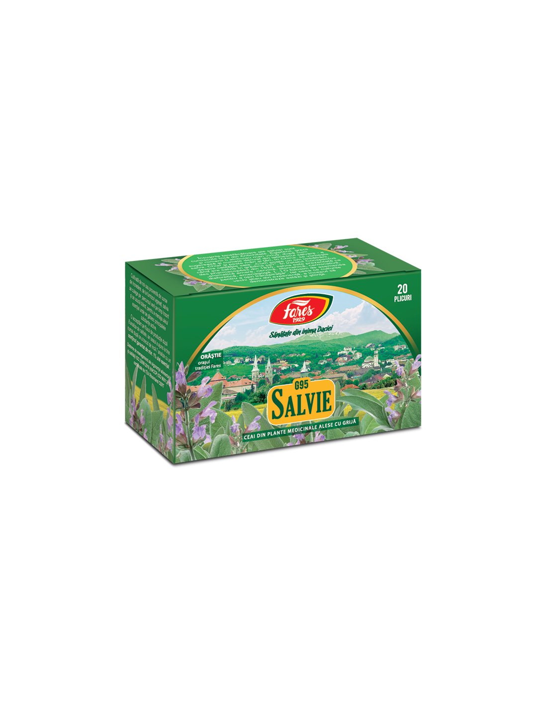 Ceai de salvie G95 de la Fares este un ceai din plante medicinale, ambalat în 20 plicuri, care conţine exclusiv frunze de Salvia officinalis L. — o plantă cunoscută tradițional pentru efectele sale asupra echilibrului hormonal la femei, funcției sudorifice și metabolismului digestiv.