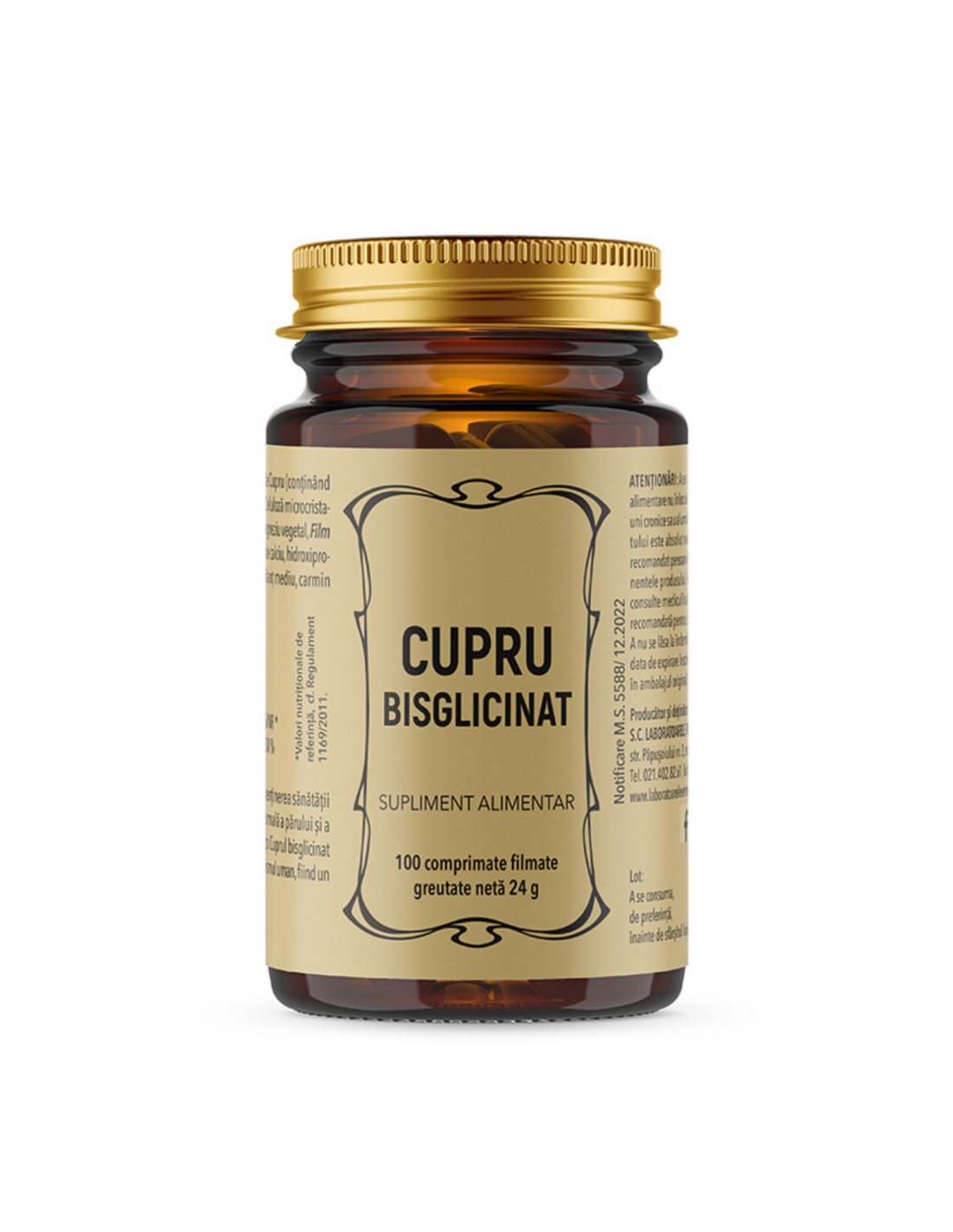 Cupru Chelat Bisglicinat 100 comprimate este un supliment alimentar produs de Laboratoarele Remedia, ce furnizează cupru sub formă chelată (bisglicinat), recunoscută pentru biodisponibilitatea superioară și toleranța digestivă ridicată.