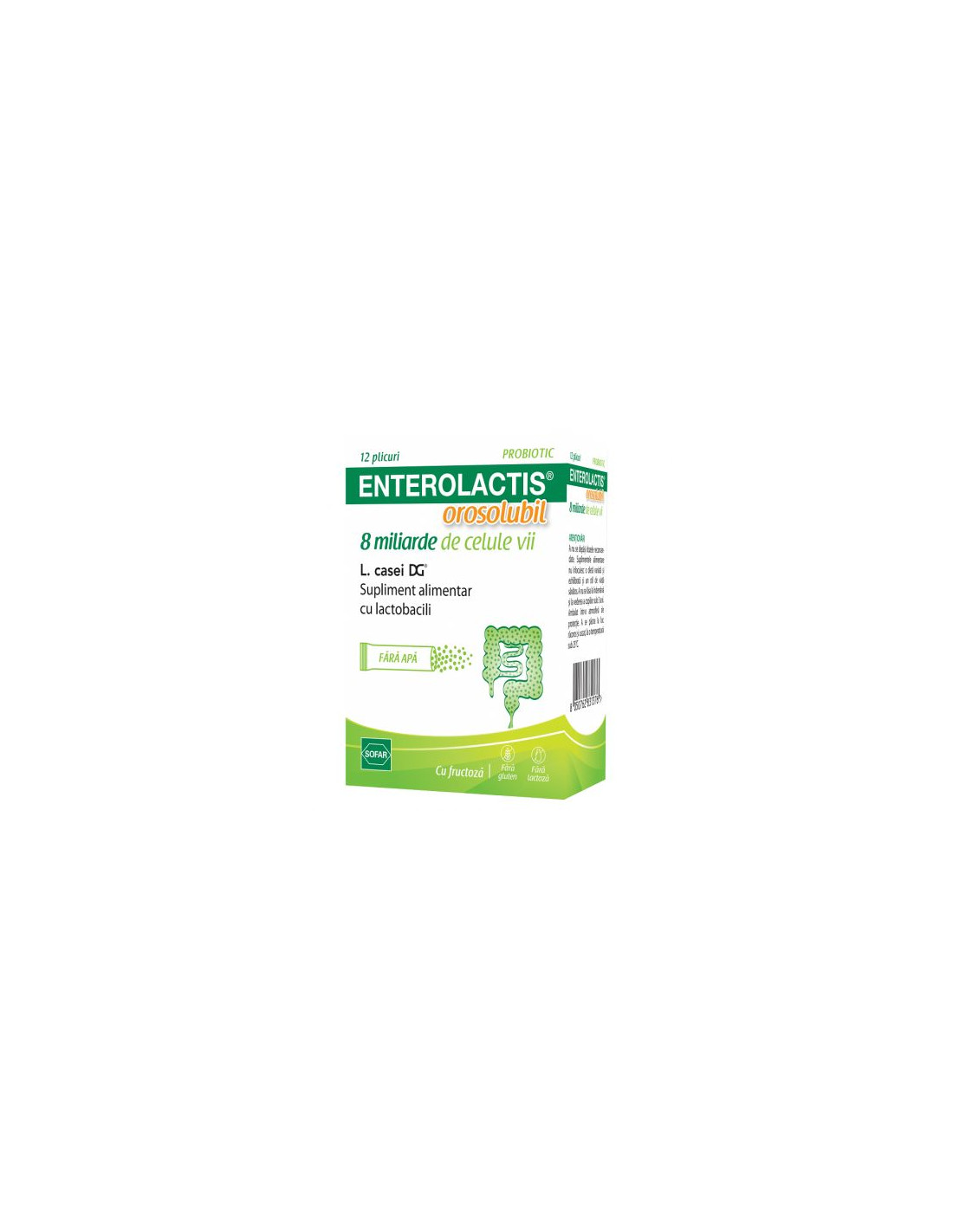 Enterolactis Orosolubil 8 miliarde 1 g × 12 plicuri este un supliment probiotic produs de Sofar, sub formă de pulbere orodispersabilă. Fiecare plic conține **8 miliarde de celule vii** din **Lactobacillus paracasei DG (CNCM I-1572)**, într-o formulă fără gluten și fără lactoză, potrivită pentru toate vârstele.
