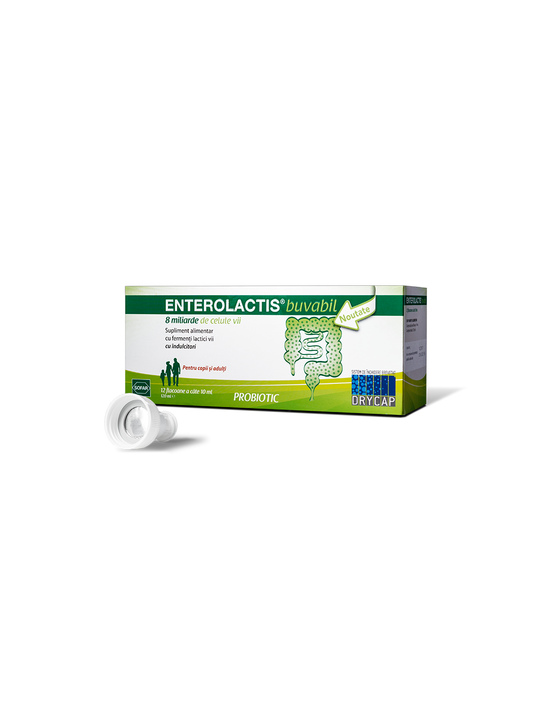 Enterolactis buvabil 10 ml × 12 flacoane este un supliment alimentar probiotic produs de Sofar, destinat refacerii și menținerii echilibrului florei intestinale. Produsul conține tulpina *Lactobacillus paracasei* DG (CNCM I-1572), cunoscută pentru stabilitatea și eficiența sa în flora intestinală.