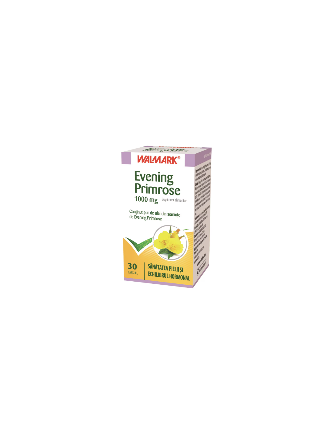 Evening Primrose 1000 mg, 30 capsule (Walmark) este un supliment alimentar pe bază de ulei de luminita de seară (Oenothera biennis), standardizat la 10 % GLA (acid gama-linolenic). Suplimentul susține sănătatea pielii, echilibrul hormonal și confortul feminin înainte și în timpul menstruației.