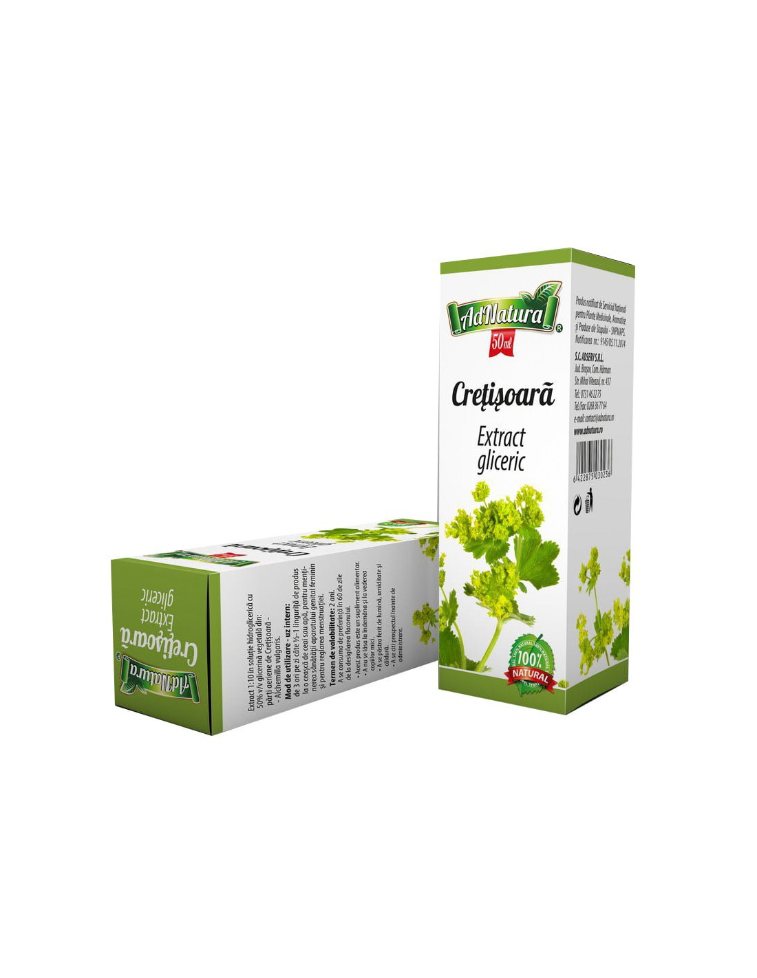 Extract Gliceric Crețișoară 50 ml – AdNatura este un supliment alimentar natural, obținut prin extracţie glicerică 1:10 într-o soluţie de 50 % v/v glicerină vegetală, din părţi aeriene de Crețișoară (Alchemilla vulgaris).
