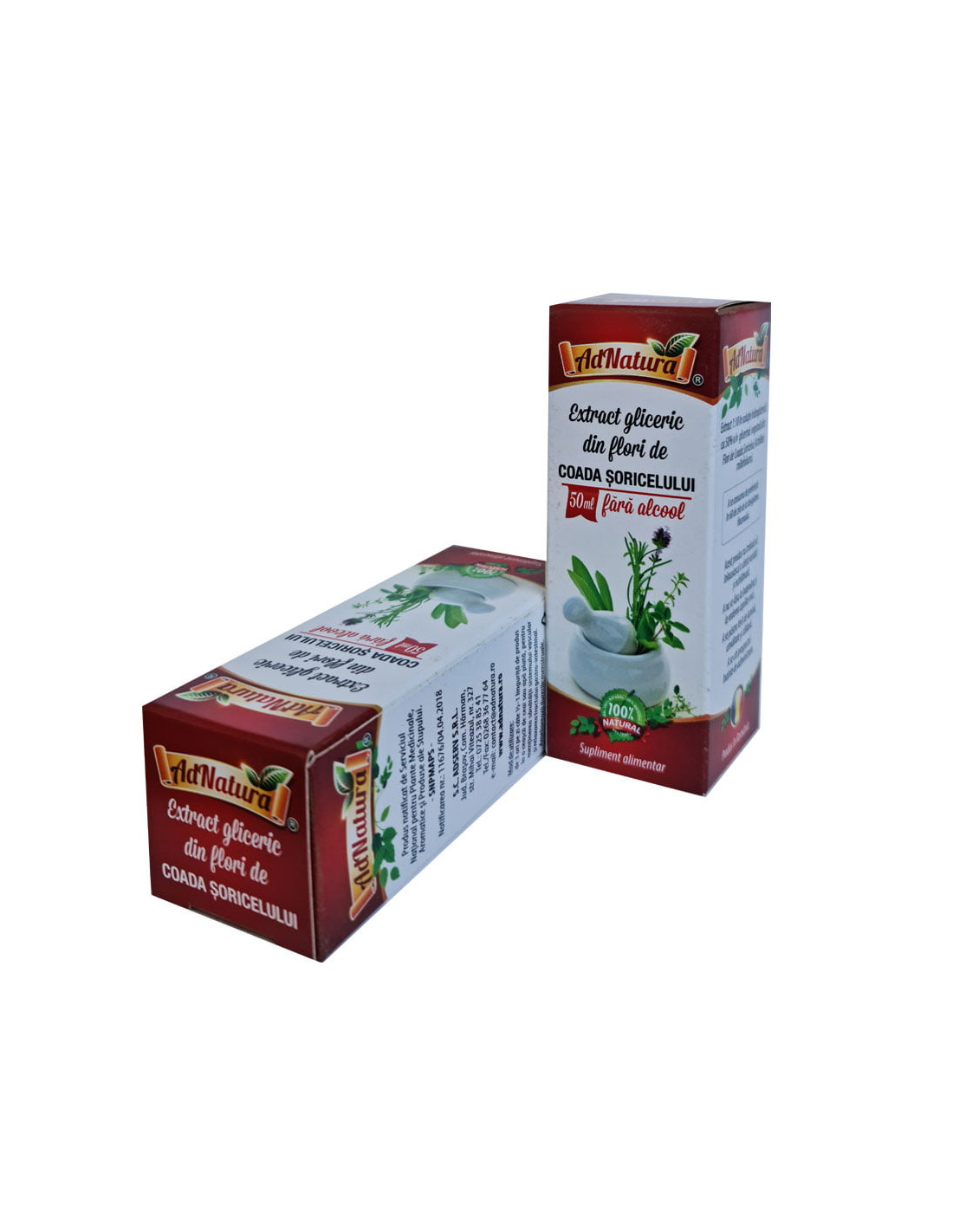 Extract Gliceric Coada Şoricelului 50 ml – AdNatura este un supliment alimentar natural, obţinut prin extracţie glicerică 1:10 într-o soluţie hidroglicerică (50% v/v glicerină vegetală) din părţi aeriene de Achillea millefolium.