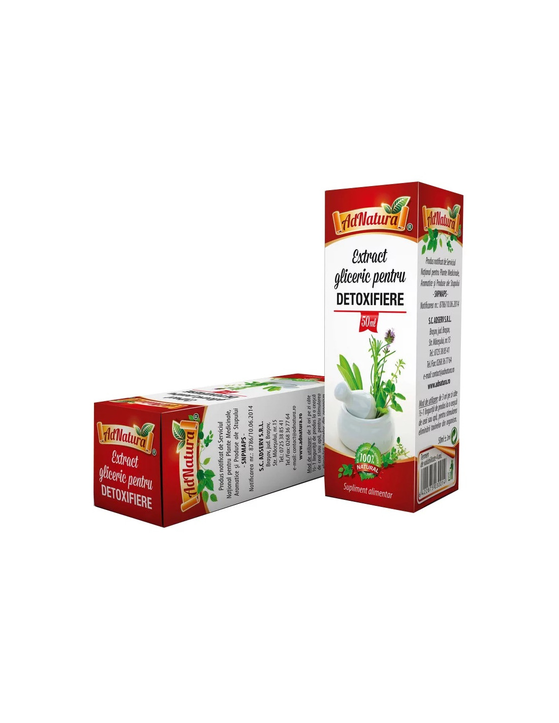 Extract Gliceric Detoxifiere 50 ml – AdNatura este un supliment alimentar natural, obţinut prin extracţie glicerică 1:10 într-o soluţie de 50% v/v glicerină vegetală, pornind de la un amestec de plante atent selecţionat pentru susţinerea proceselor naturale de detoxifiere ale organismului.