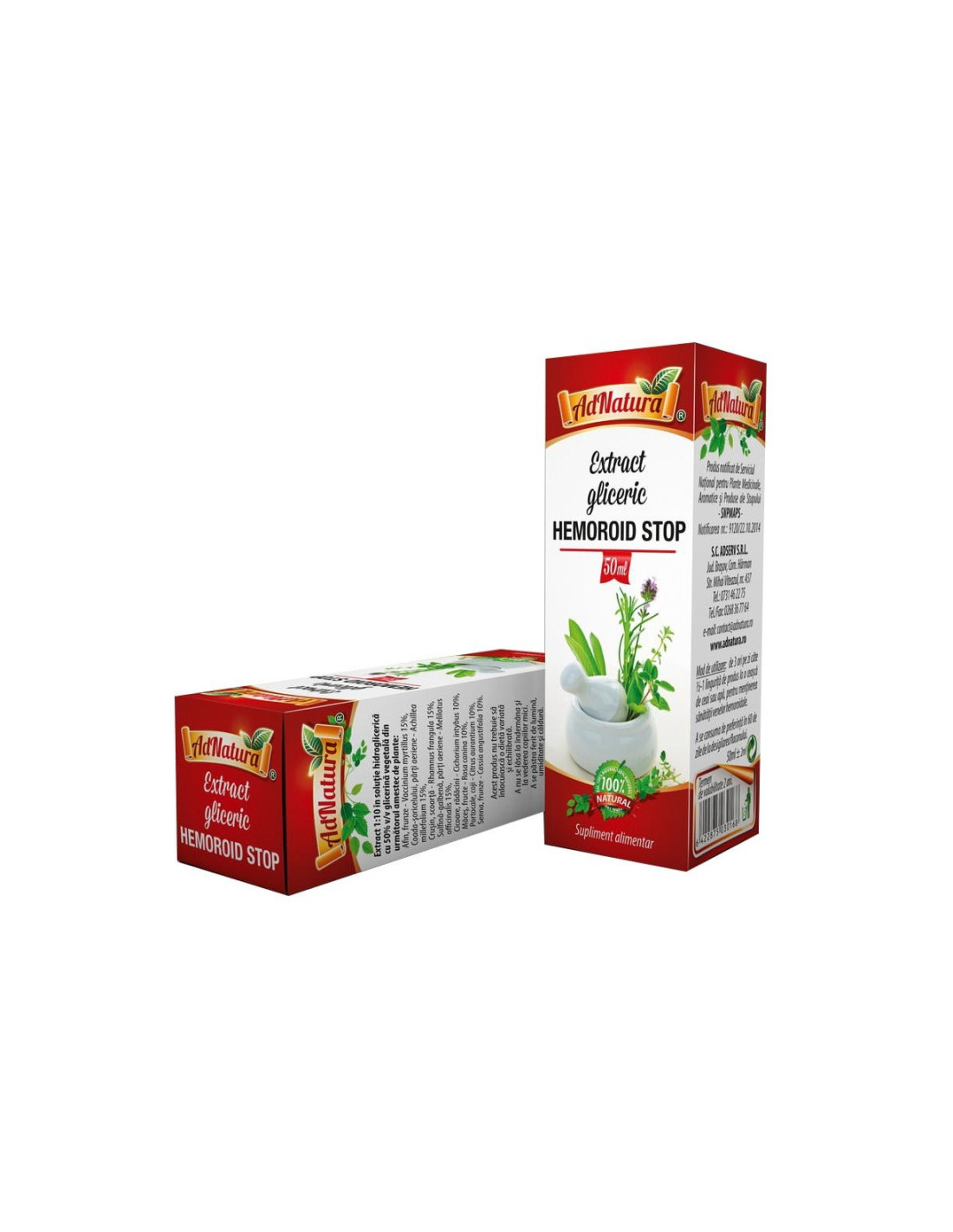 Extract Gliceric Hemoroid Stop 50 ml – AdNatura este un supliment alimentar natural, obţinut prin extracţie glicerică 1:10 într-o soluţie cu 50% v/v glicerină vegetală. Este special formulat pentru susţinerea sănătăţii venoase și pentru ameliorarea disconfortului asociat hemoroizilor.