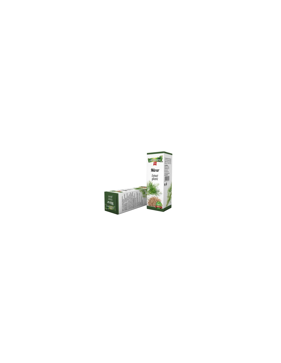 Extract Gliceric Mărar 50 ml – AdNatura este un supliment alimentar natural, pe bază de extract 1:10 în soluţie hidroglicerică cu 50% v/v glicerină vegetală, obţinut din seminţe de Anethum graveolens. Produsul este recomandat pentru susţinerea normală a ciclului menstrual, reglarea secreţiei hormonale la femei, stimularea lactaţiei la lauze, reducerea balonării şi flatulenţei.