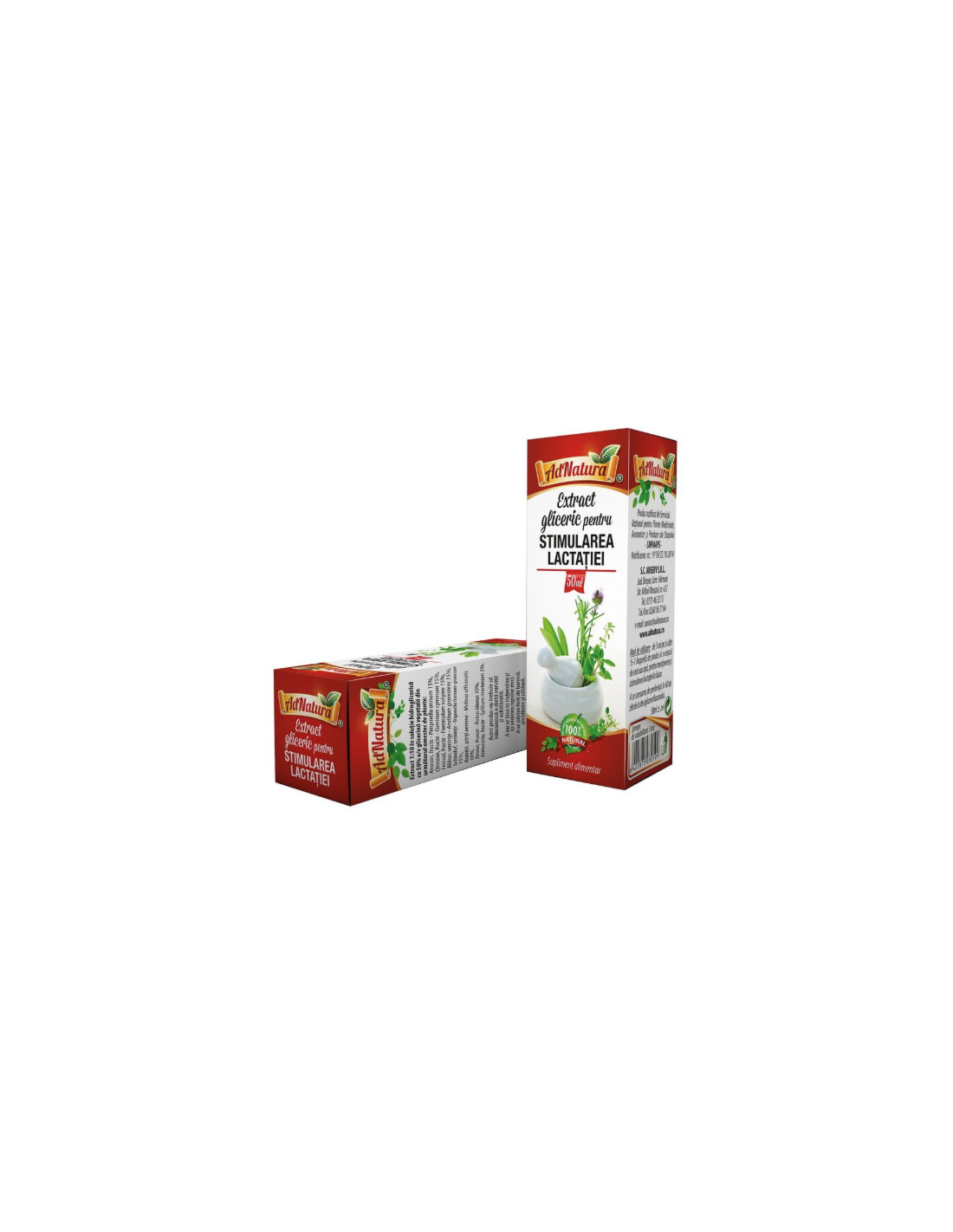 Extract Gliceric Stimularea Lactaţiei 50 ml – AdNatura este un supliment alimentar 100% natural, obţinut prin extracţie glicerică (1:10) într-o soluţie hidroglicerică 50% v/v, dintr-un amestec de plante cu efect galactogog, estrogenic şi carminativ.