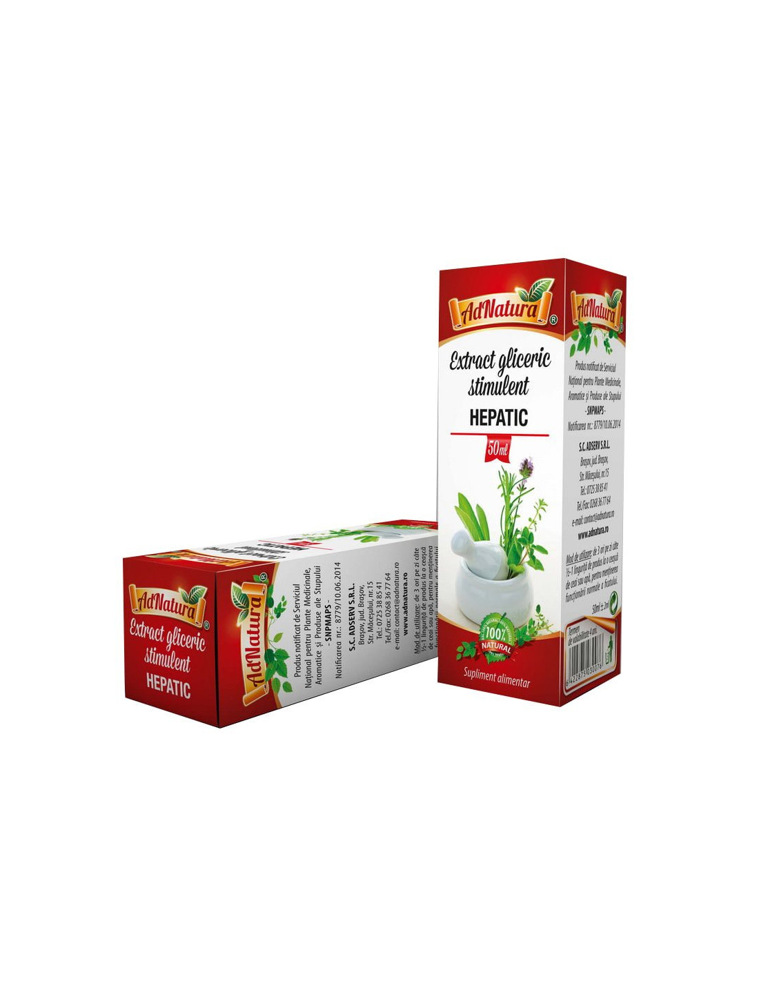 Extract Gliceric Stimulent Hepatic 50 ml – AdNatura este un supliment alimentar natural, obținut prin extracție glicerică dintr-un amestec de plante recunoscute în fitoterapie pentru susținerea funcţiei hepatice şi a sănătăţii vezicii biliare.