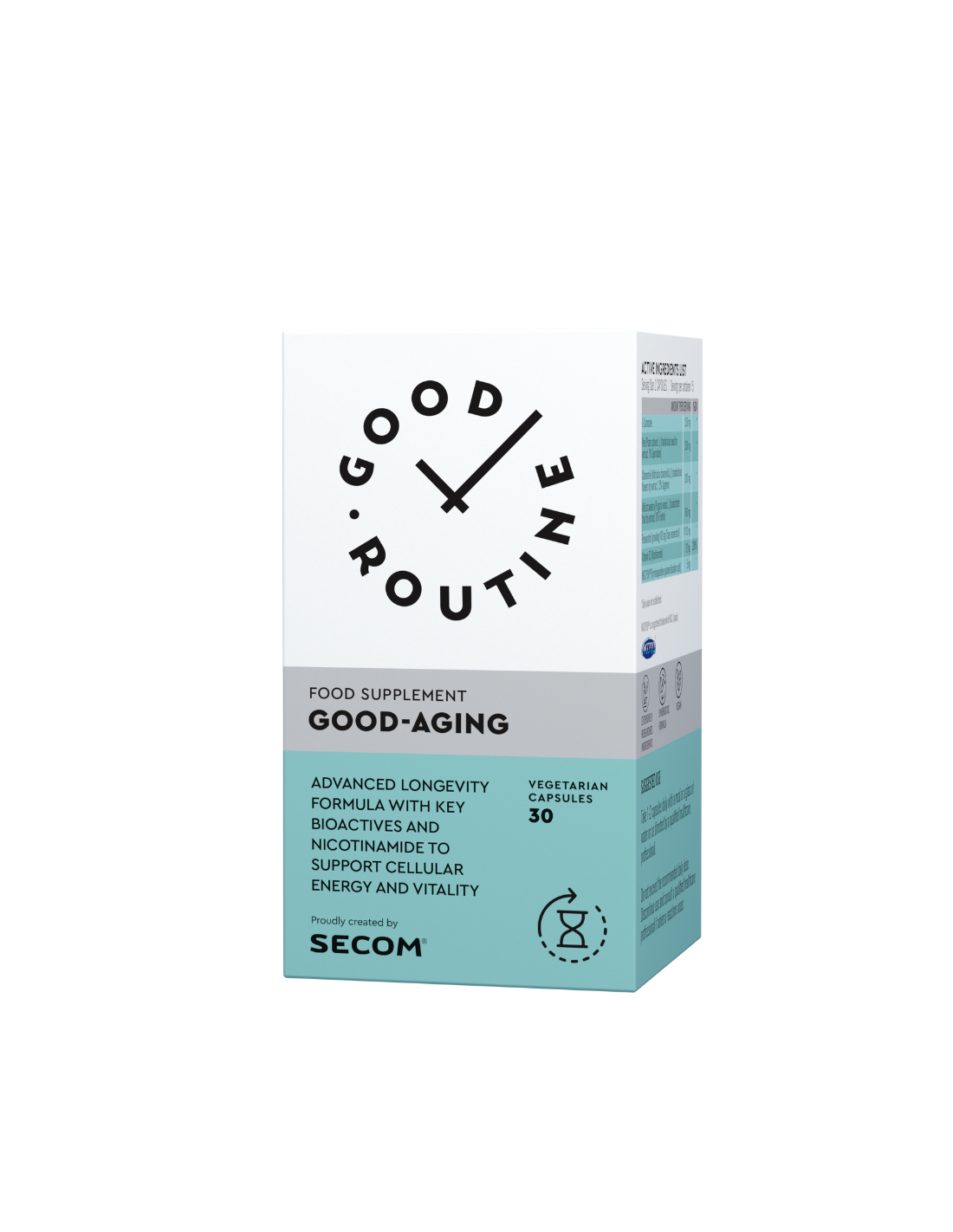 Good-Aging – 30 capsule vegetale este un supliment alimentar din gama Good Routine – Secom, conceput pentru susținerea longevității sănătoase și creșterea vitalității. Formula include MGCPQQ® (ingredient patentat), carnozină, resveratrol, fisetină, spermidină și vitamina B3 (nicotinamidă).