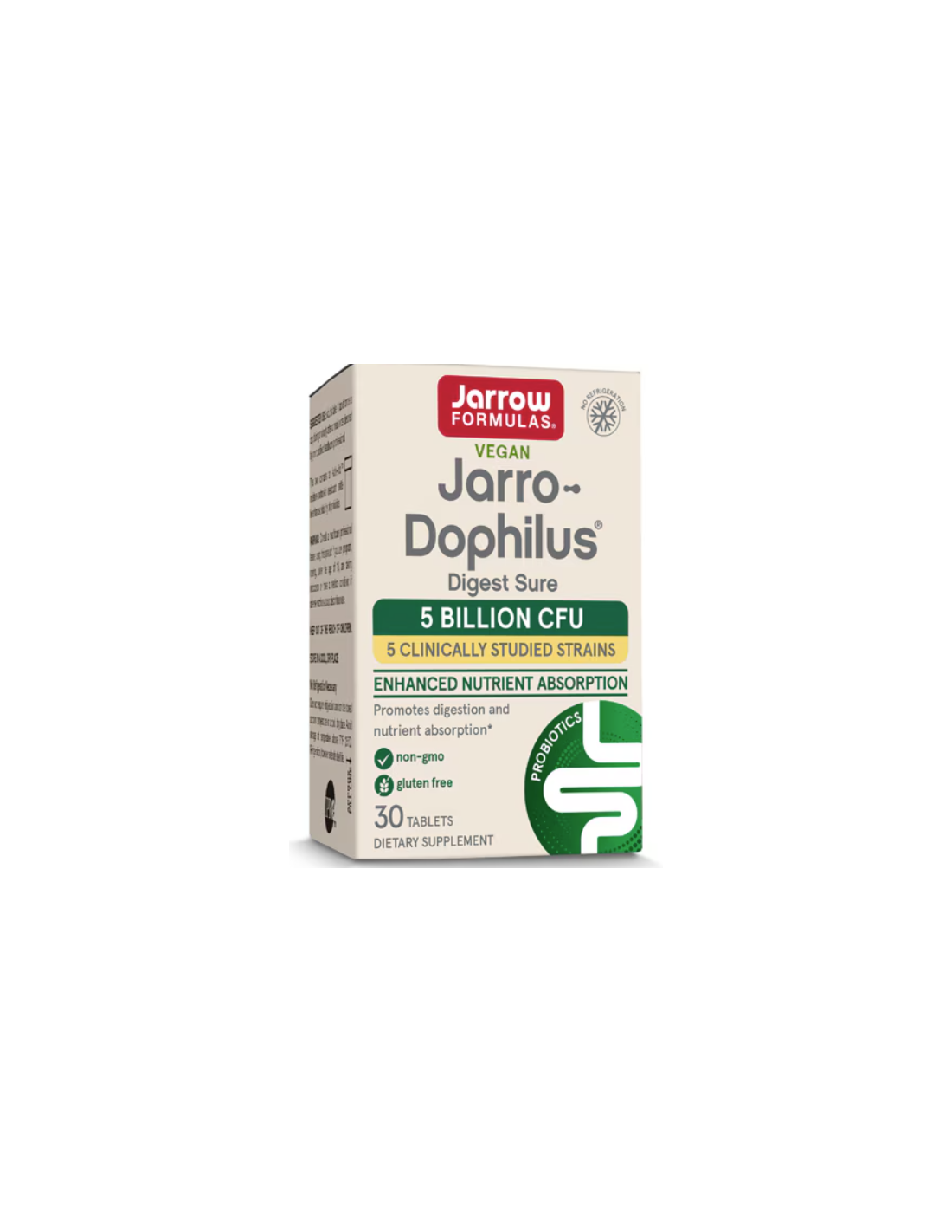 Jarrow Jarro-Dophilus Digest Sure – 30 tablete bi-layer este un supliment alimentar sinbiotic ce combină 5 tulpini probiotice microîncapsulate cu un amestec de enzime digestive, conceput pentru a susține digestia și absorbția nutrienților.*
