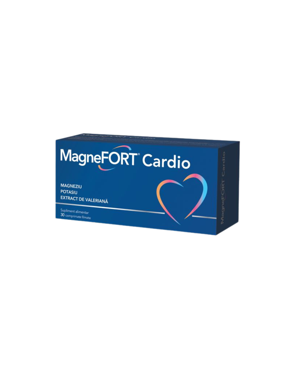 MagneFort Cardio este un supliment alimentar complex, produs de Biofarm, care conține magneziu, potasiu și vitaminele B1, B6 și B12, nutrienți esențiali pentru menținerea sănătății inimii și echilibrului electrolitic.