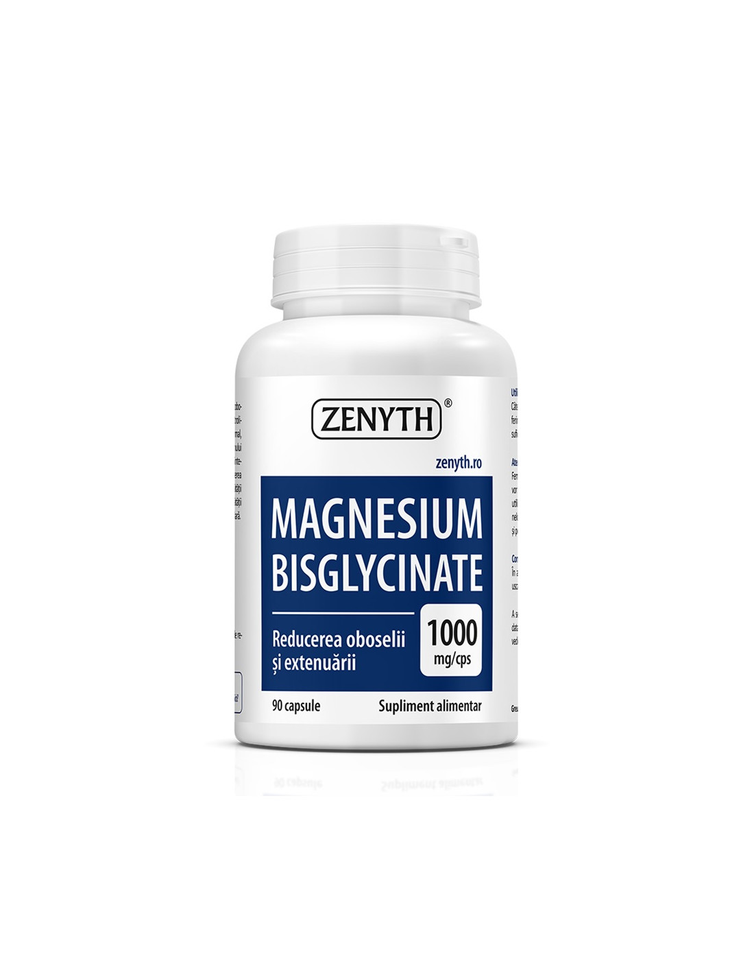 Magnesium Bisglycinate 90 capsule – Zenyth este un supliment alimentar care oferă bisglicinat de magneziu de înaltă toleranță, 1 000 mg pe capsulă (echivalent ~110 mg magneziu ionic) — o formă de magneziu bine tolerată, cu biodisponibilitate ridicată și cu risc redus de efecte laxative.