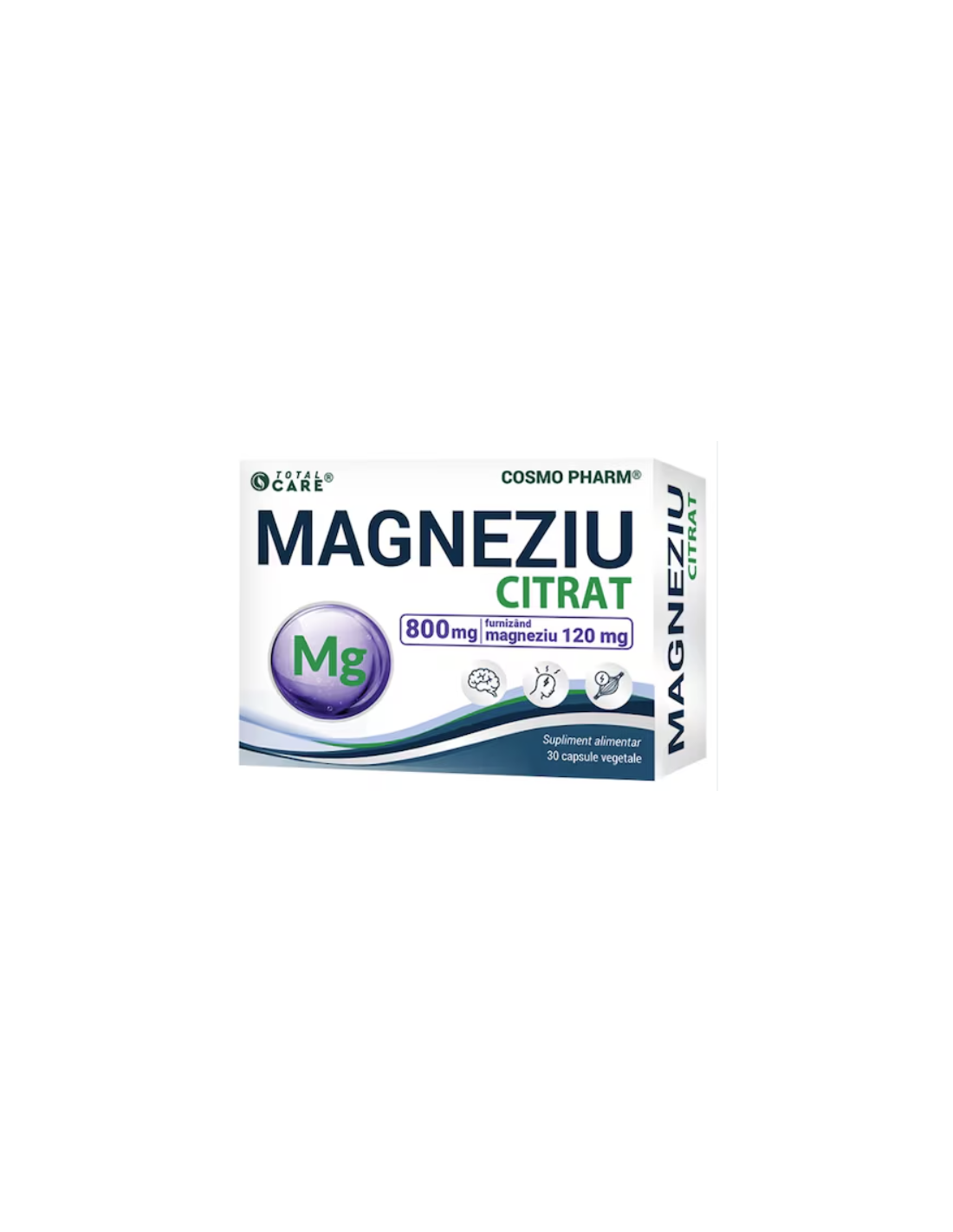 Magneziu Citrat 800 mg – 30 capsule vegetale este un supliment alimentar oferit de Cosmopharm, ce conține citrat de magneziu 800 mg per capsulă, furnizând ~ 120 mg magneziu elemental.
