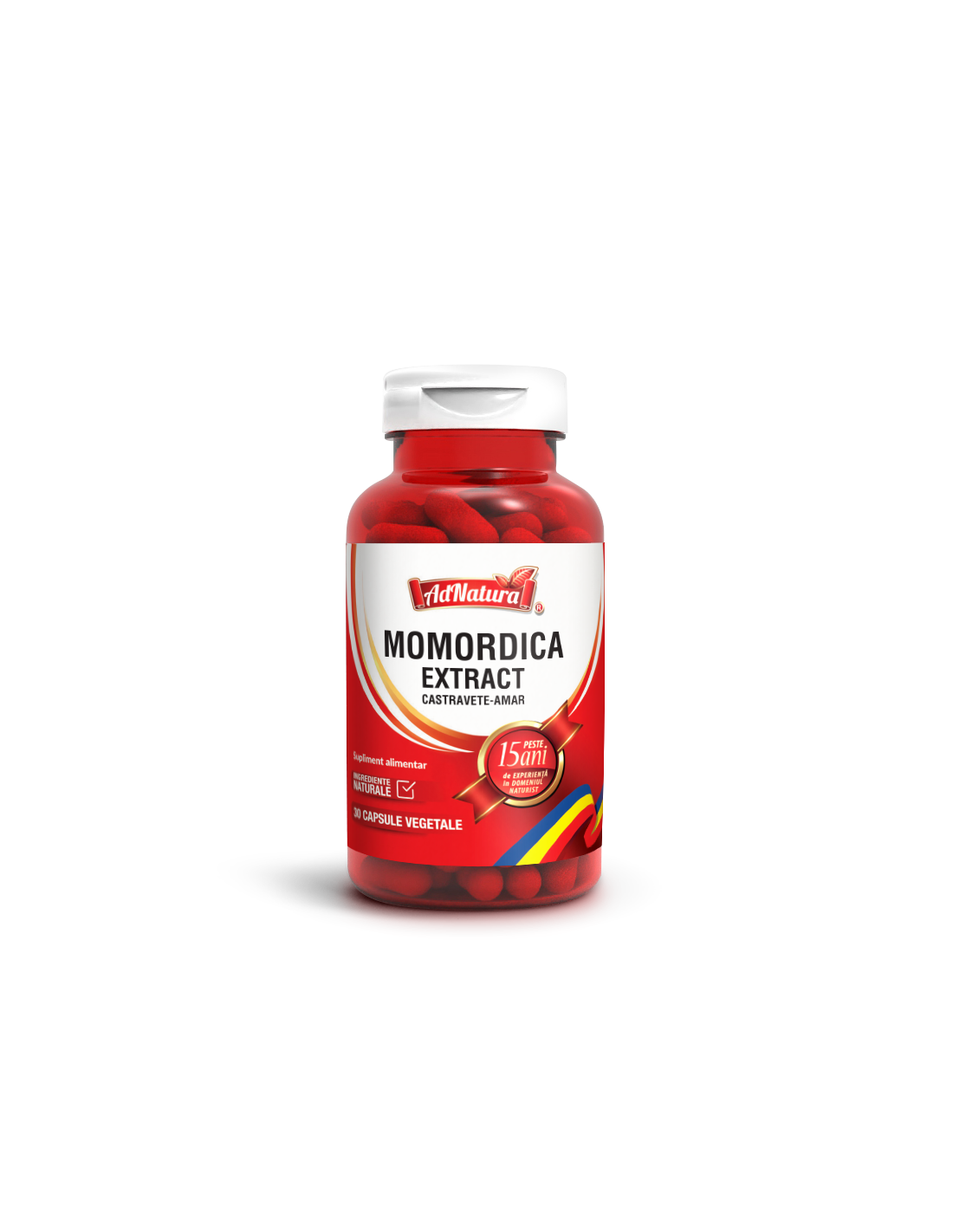 Momordica Extract Castravete-Amar AdNatura este un supliment alimentar natural obținut din fructele plantei Momordica charantia, cunoscută și ca “castravete amar” sau “pepenele sălbatic indian”. Datorită conținutului bogat în compuși activi cu acțiune asemănătoare insulinei (charantină, polipeptid-P), produsul contribuie la reglarea metabolismului glucidic și la menținerea glicemiei în limite normale.