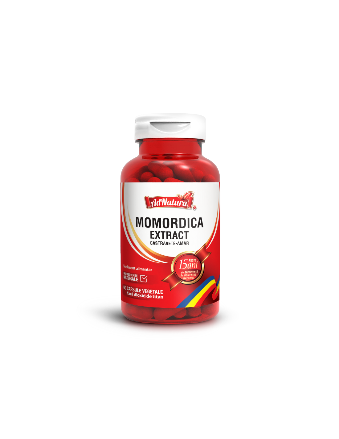 Momordica Extract Castravete-Amar AdNatura este un supliment alimentar natural pe bază de extract standardizat din fructele plantei Momordica charantia (numită popular castravete-amar sau pepenele sălbatic indian). Formula concentrată sprijină echilibrul glicemic, metabolismul glucidic și funcția normală a pancreasului, fiind un aliat valoros în menținerea energiei și a digestiei sănătoase.