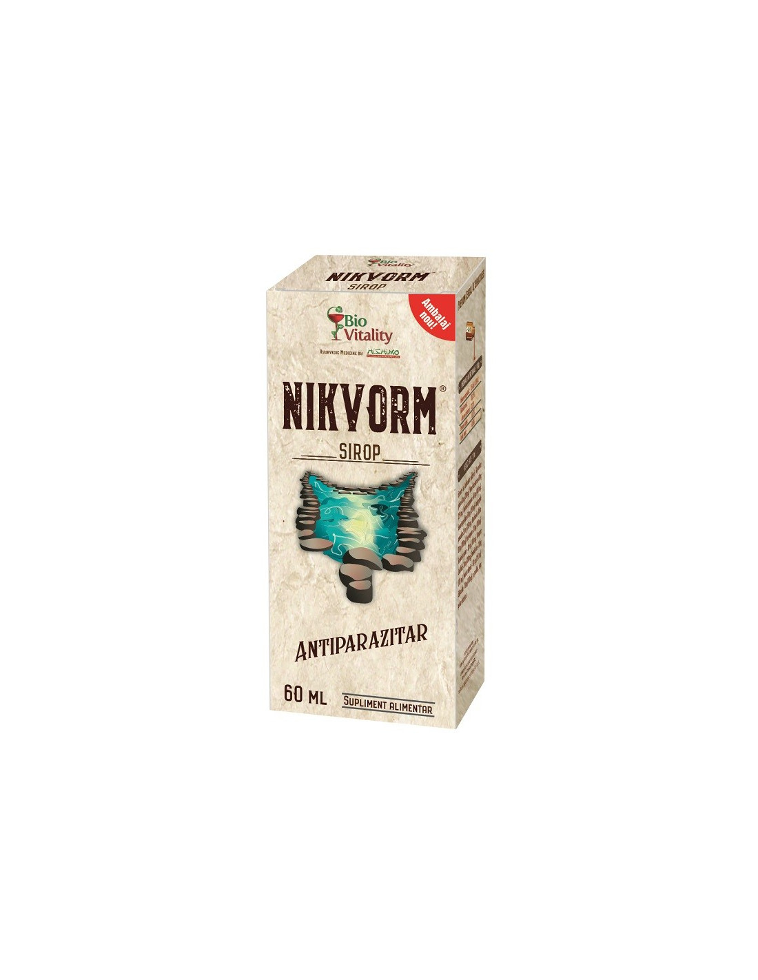 Nikvorm sirop antiparazitar intestinal 60 ml Bio Vitality este un supliment alimentar pe baza de extracte vegetale atent selectionate, destinat sustinerii eliminarii parazitilor intestinali, detoxifierii organismului si mentinerii unui tranzit digestiv echilibrat.