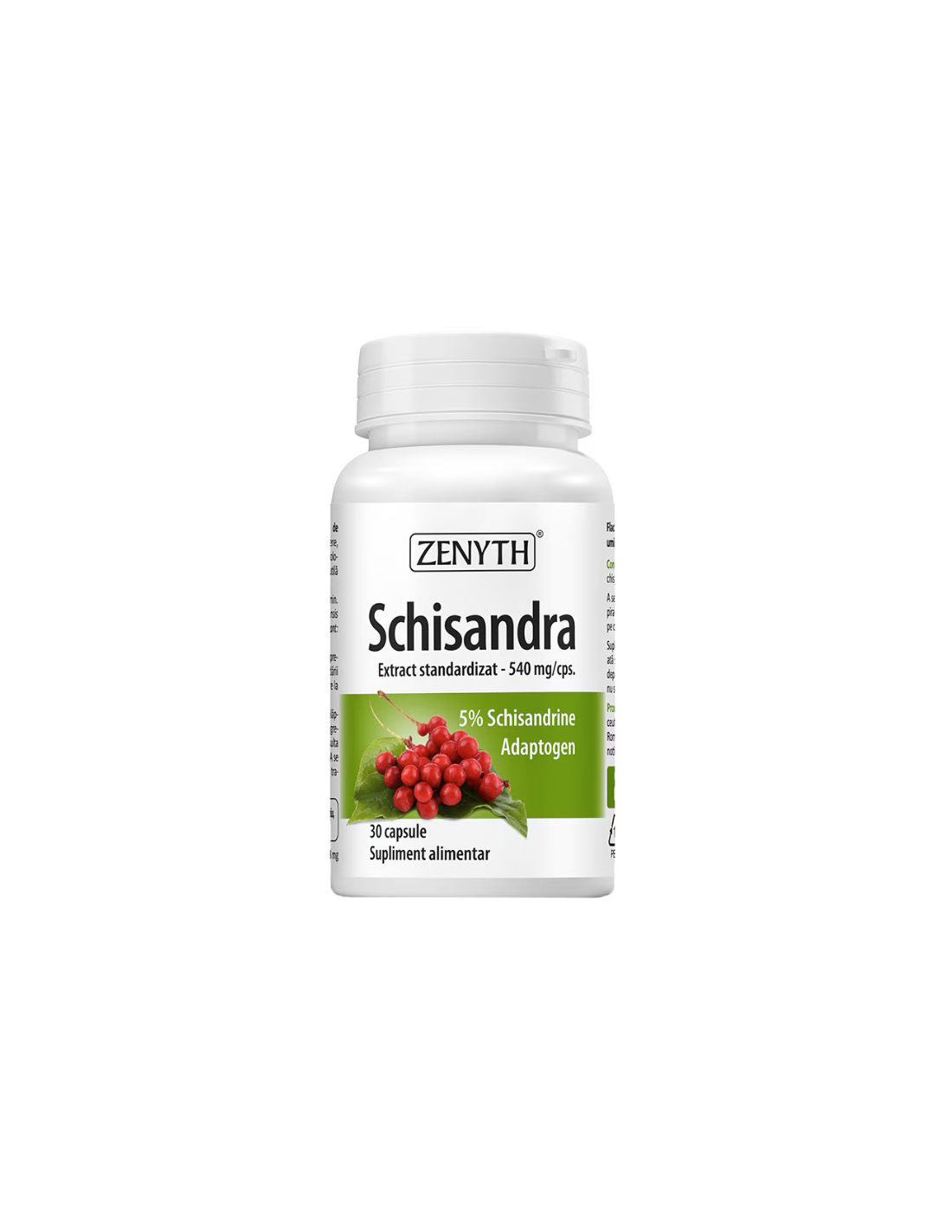- Extract standardizat de Fructe de Schisandra chinensis (percentaj adaptogen stabil) — tipic între 4-10 % schisandrina și lignani caracteristici
