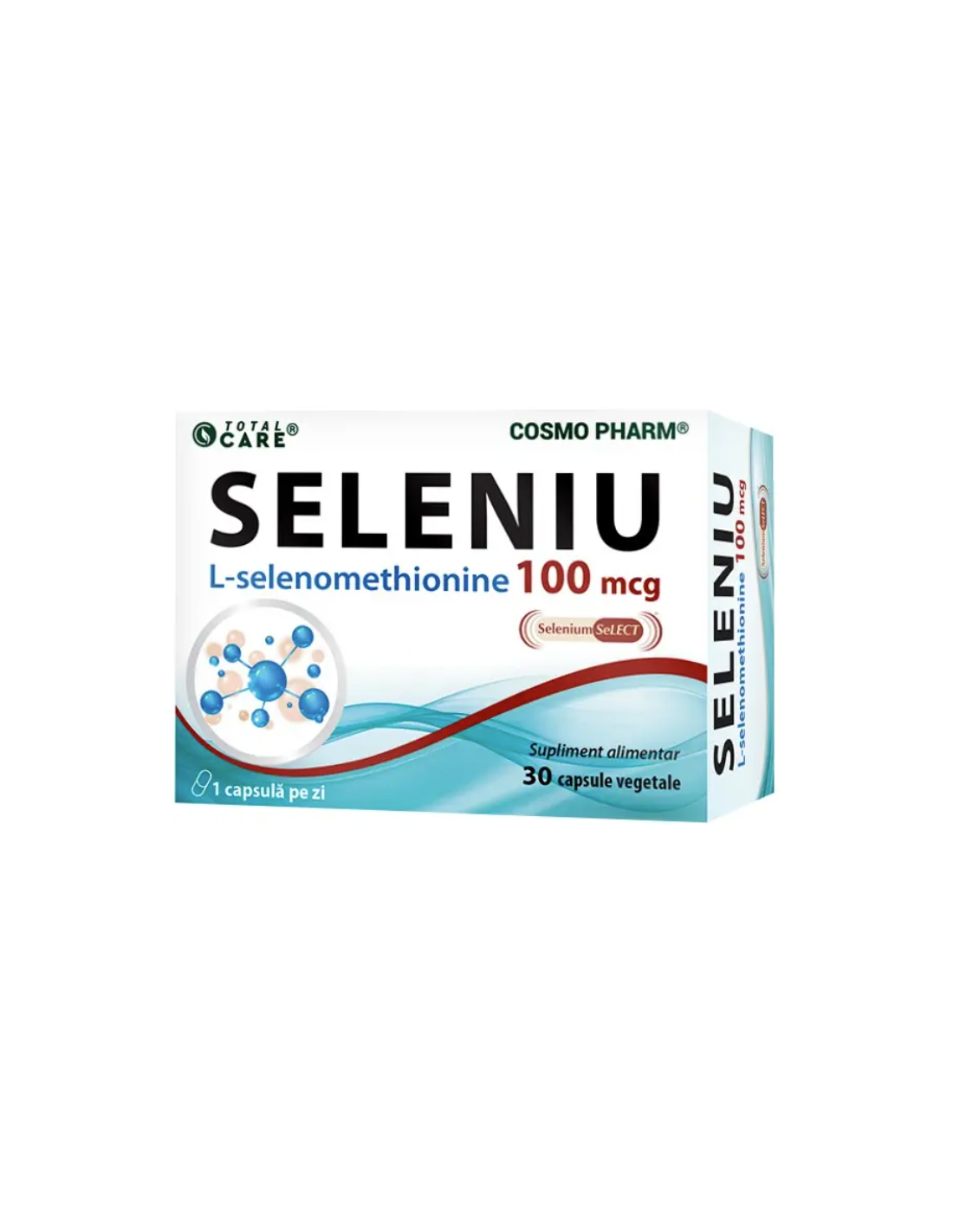 Seleniu 100 mcg – 30 capsule vegetale de la Cosmopharm este un supliment alimentar ce furnizează seleniu sub formă de L-selenomethionină (Selenium Select®) cu bună biodisponibilitate.