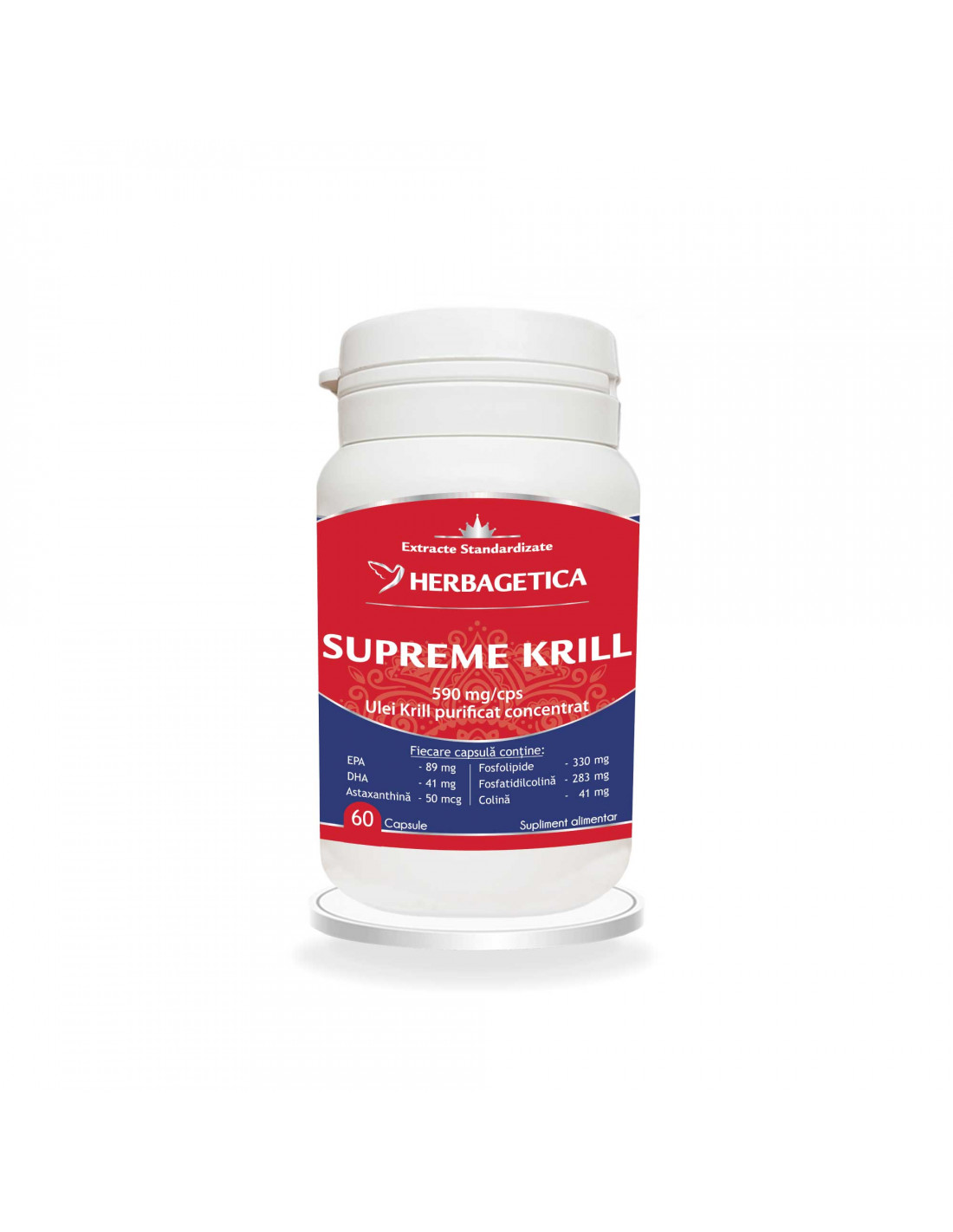 Supreme Krill Omega 3 Forte de la Herbagetica este recomandat pentru că furnizează Omega-3 EPA și DHA sub formă de fosfolipide, cea mai bine absorbită formă de organism. Formula este completată de colină și astaxantină, care cresc eficiența acizilor grași și protejează celulele împotriva oxidării.