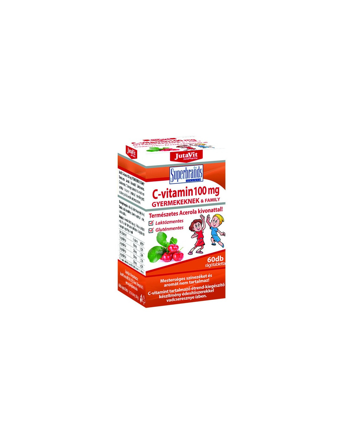 JutaVit C-Vitamin 100 mg Kids & Family este un supliment alimentar sub formă de tablete masticabile, cu extract natural de acerola, destinat copiilor și familiei. Produsul este fără lactoză, fără gluten, fără coloranți sau arome artificiale.