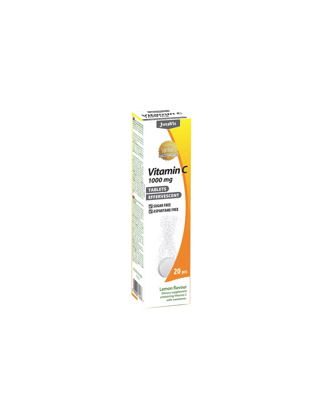 JutaVit Vitamina C 1000 mg – 20 tablete efervescente este un supliment alimentar, conceput pentru susținerea sistemului imunitar, reducerea oboselii și menținerea funcțiilor normale ale organismului. Fiecare tabletă este efervescentă și are aromă de lămâie.
