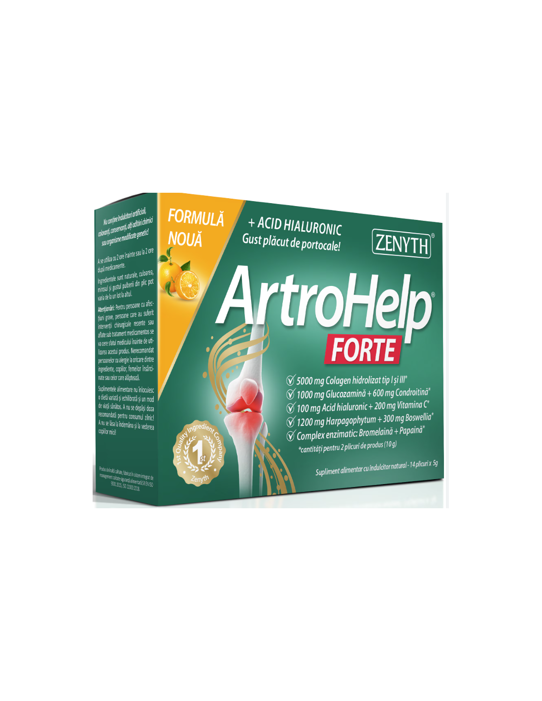 ArtroHelp Forte – 14 plicuri, Zenyth este un supliment alimentar sub formă de pulbere monodoză, dezvoltat pentru sprijinul sănătății articulare și regenerarea țesuturilor conjunctive.