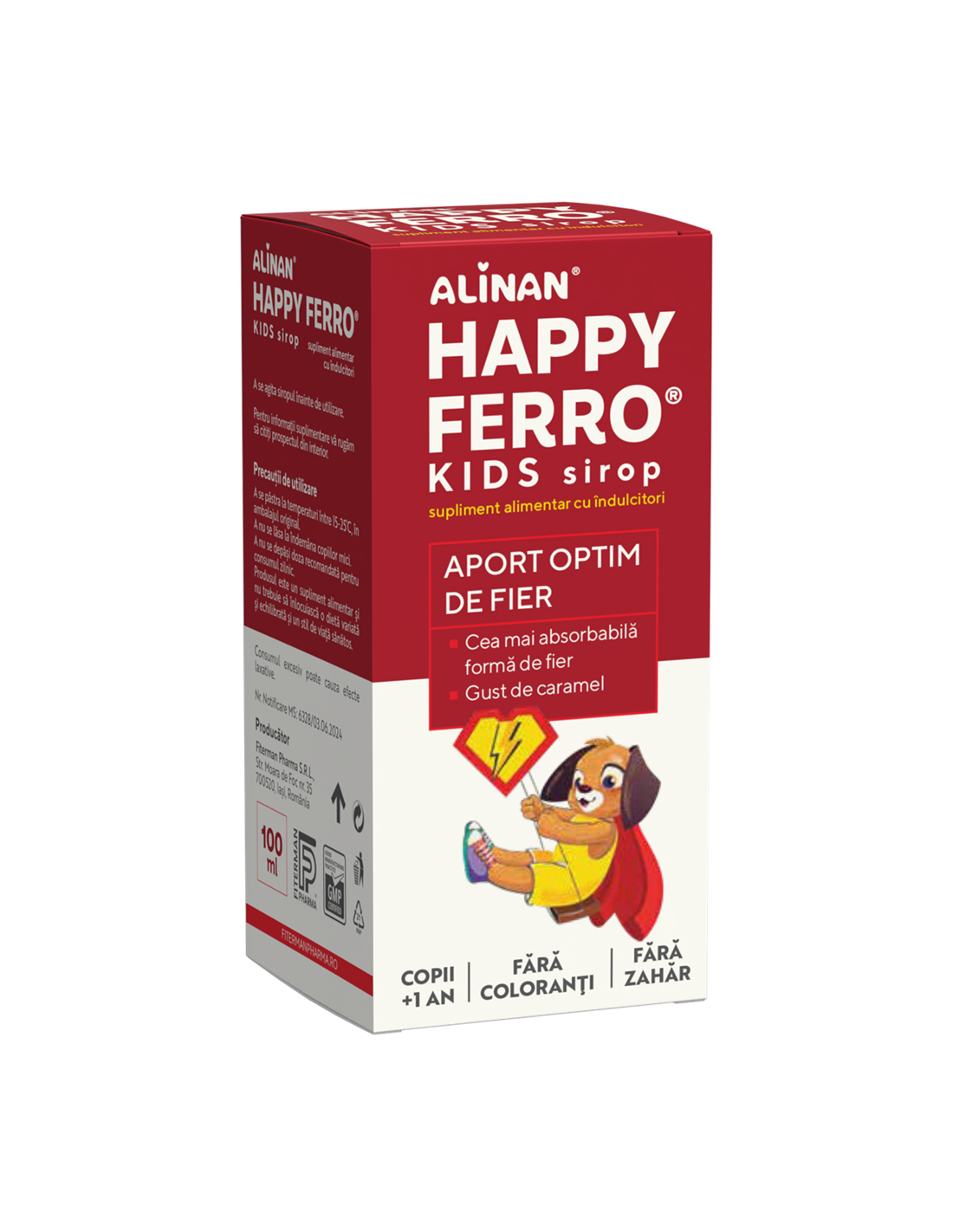 Alinan HappyFerro Kids sirop fara zahar, 100 ml, Fiterman este un supliment alimentar special conceput pentru copii, care sustine aportul optim de fier, contribuie la formarea normala a hemoglobinei si ajuta la reducerea oboselii, avand o formula fara zahar adaptata nevoilor celor mici.