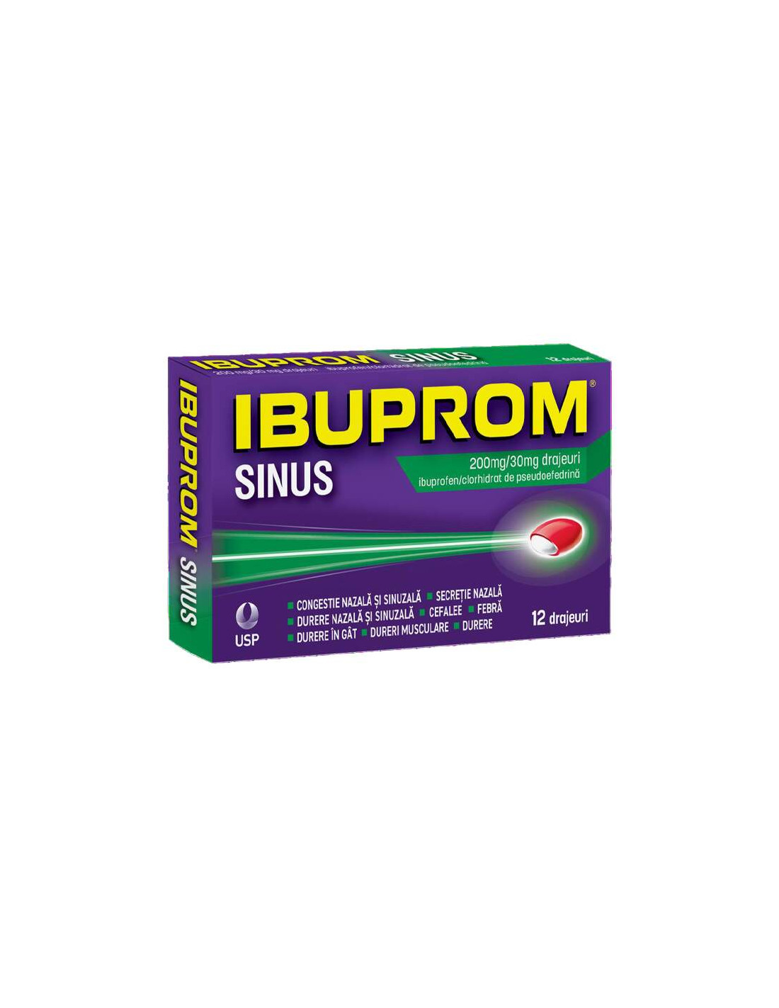 Ibuprom Sinus 200 mg / 30 mg – 12 drajeuri este un medicament combinat care asociază ibuprofen (200 mg) — cu rol antiinflamator și analgezic — cu pseudoefedrină HCl (30 mg) — ca decongestionant nazal. Este destinat ameliorării simptomelor sinusurilor și ale răcelii care includ durere, febră, congestie nazală și presiune sinusală. (Analog cu formulări similare ibuprofen + pseudoefedrină)
