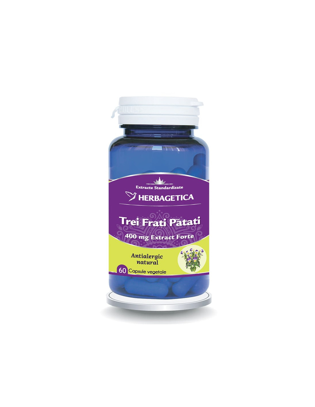 Trei Frați Pătați de la Herbagetica este recomandat datorită extractului concentrat 4:1, 400 mg per capsulă, care oferă un efect intens antialergic, antiinflamator și decongestionant asupra căilor respiratorii. Este utilizat tradițional pentru alergii, rinite, erupții cutanate și afecțiuni respiratorii datorită efectului antihistaminic natural.