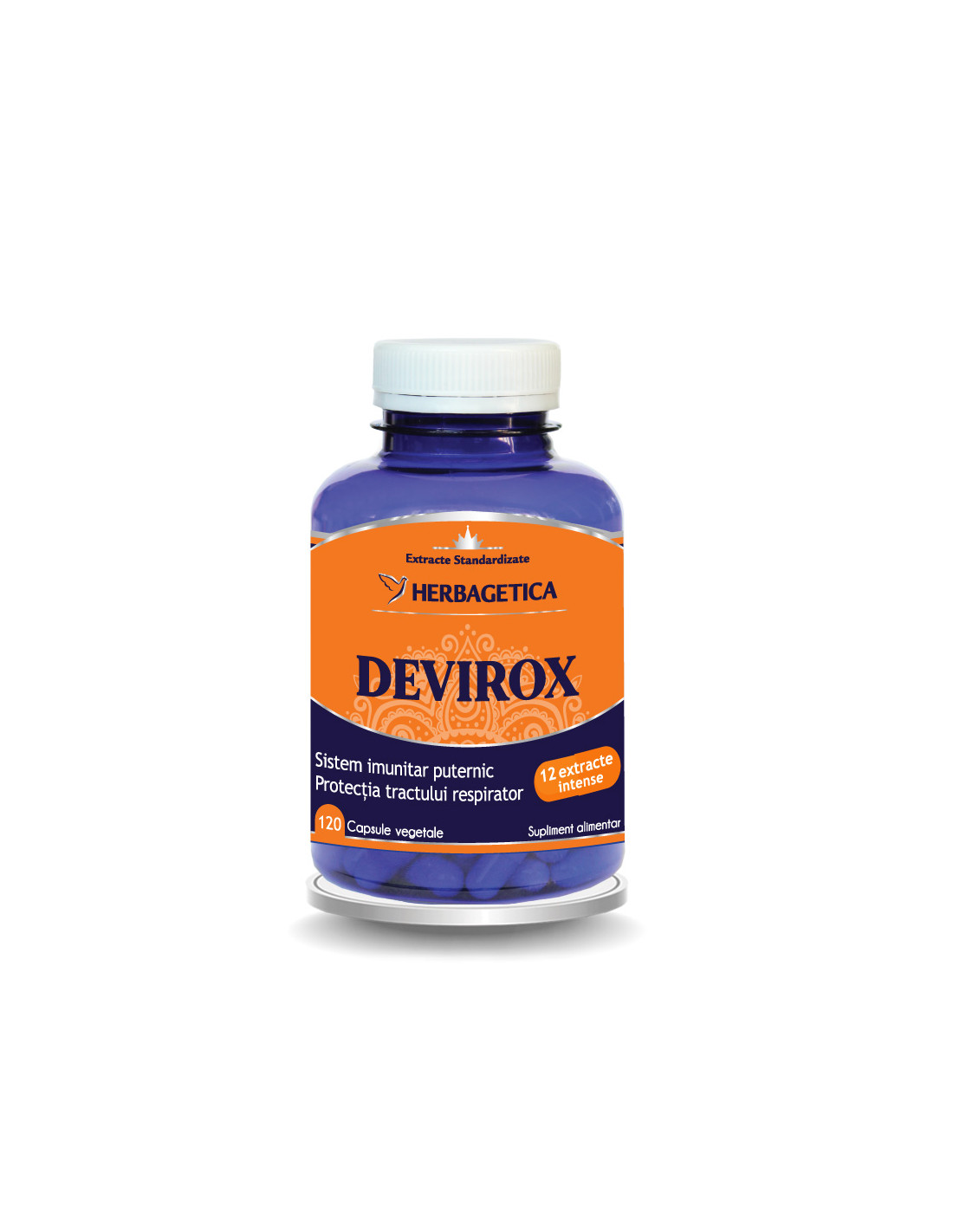 Devirox este un supliment complex, cu acțiune antivirală intensă, imunostimulatoare și protectoare pentru sistemul respirator. Formula sa concentrează 12 extracte naturale standardizate, alături de vitamine și minerale naturale, oferind o triplă acțiune: elimină virusurile și bacteriile, întărește sistemul imunitar și curăță căile respiratorii.