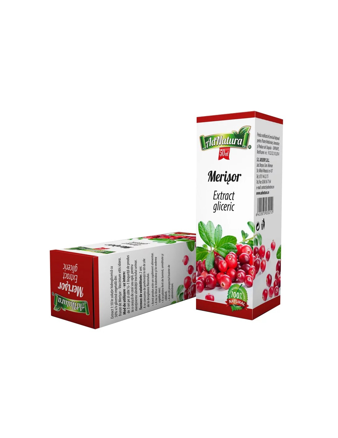 Extract Gliceric Merişor 50 ml – AdNatura este un supliment alimentar pe bază de plante, obținut prin extracţie glicerică 1:10 în soluţie de glicerină vegetală (50% v/v). Produsul este formulat pentru a susţine sănătatea tractului urinar, funcția vezicii urinare şi rinichilor.