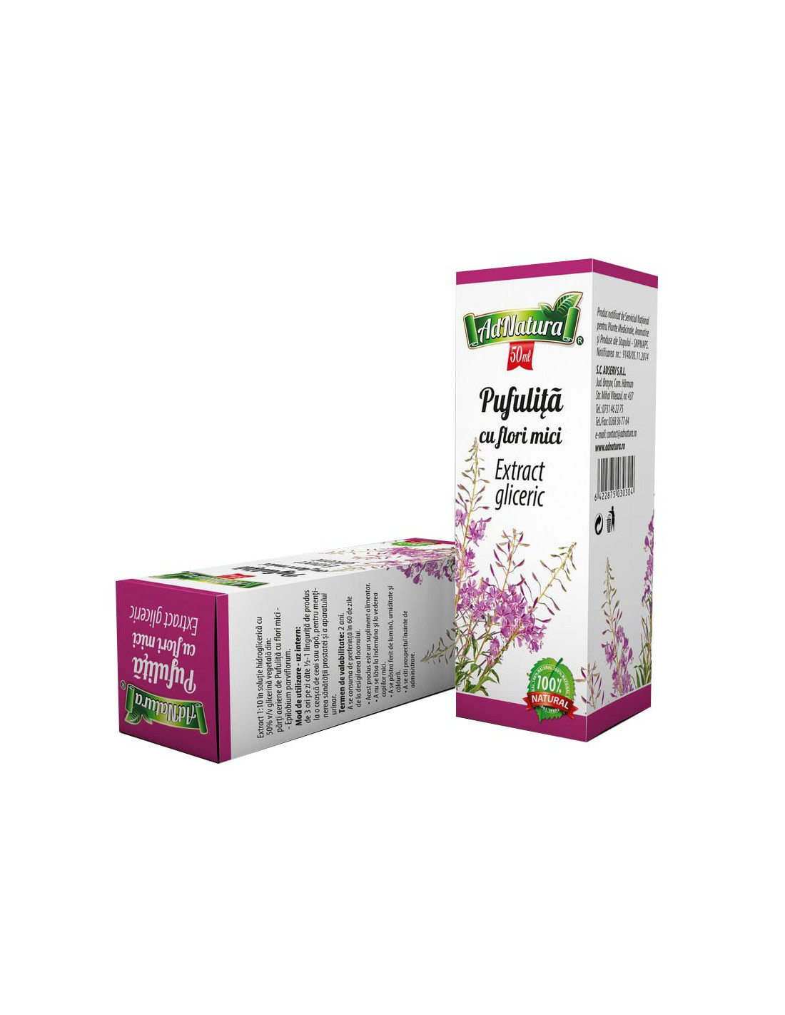 Extract Gliceric Pufuliţă cu Flori Mici 50 ml – AdNatura este un supliment alimentar natural, obţinut prin extracţie glicerică (extract 1:10 în soluţie hidroglicerică cu 50% v/v glicerină vegetală) din părţi aeriene de Pufuliţă cu flori mici (Epilobium parviflorum).