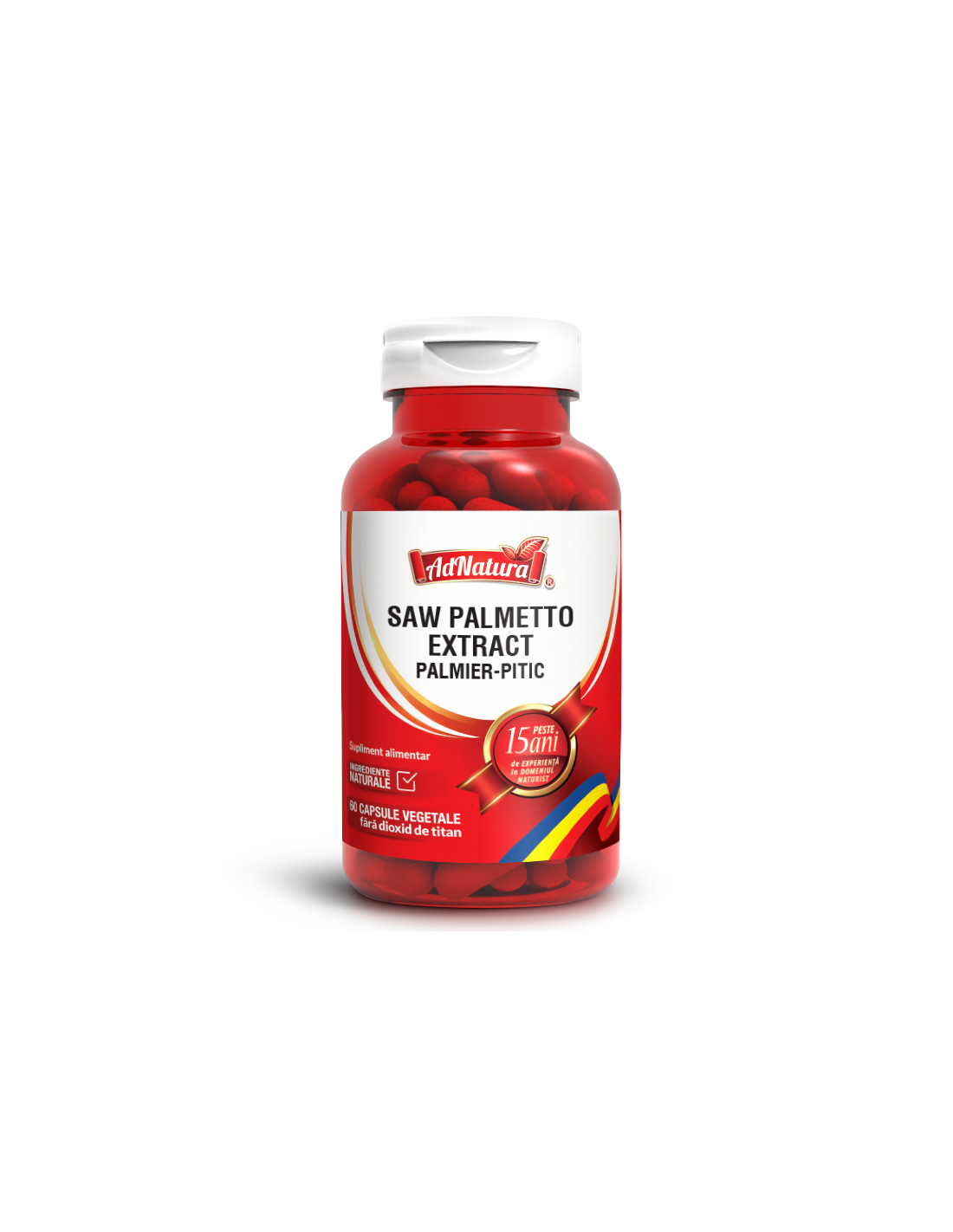 Saw Palmetto Extract AdNatura este un supliment alimentar ce conţine extract standardizat din fructe de Serenoa repens (palmier-pitic), plantă folosită tradiţional pentru susţinerea sănătăţii prostatei, a sistemului urinar şi a echilibrului hormonal masculin. Formula este destinată bărbaţilor care doresc un sprijin herbomineral natural pentru buna funcţionare a sistemului urogenital.